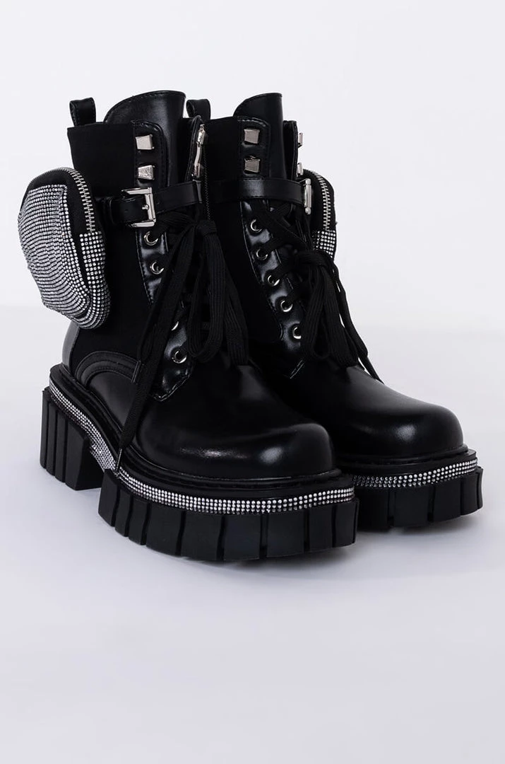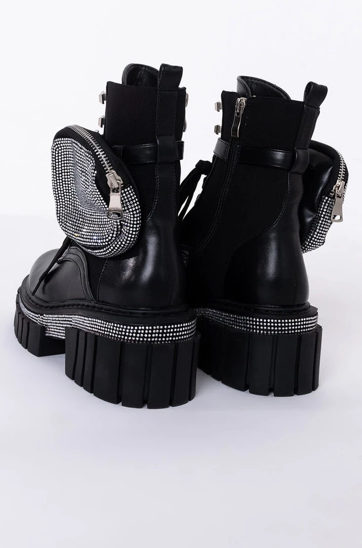 The AZALEA WANG Rani Chunky Bootie in Black is a cute combat boot features a mid calf height silhouette, shimmering rhinestone embellished detailing, a chunky rubber platform sole, a lace up front, faux leather upper, elastic side paneling, and a tonal inner ankle zipper. Complete with a belted rhinestone-embellished zip top cargo pocket and ankle loop detail at the ankle for easy on and off.