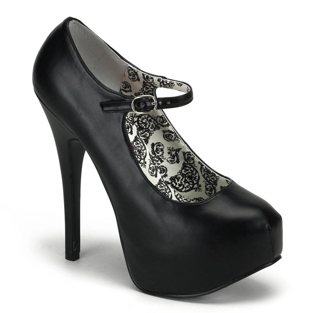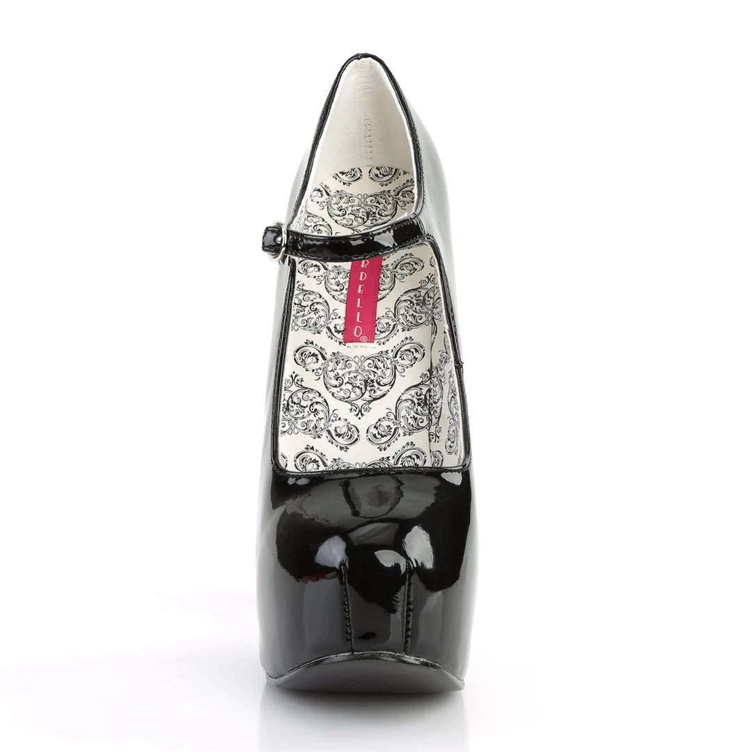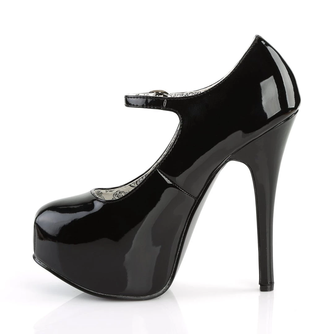 A Closed toe Mary Janes with reversable sequins, stiletto heel and concealed platform. This high heel platform shoe has a patent leather upper with an adjustable ankle strap, a leather lining, a rounded toe, and a rubber bottom.