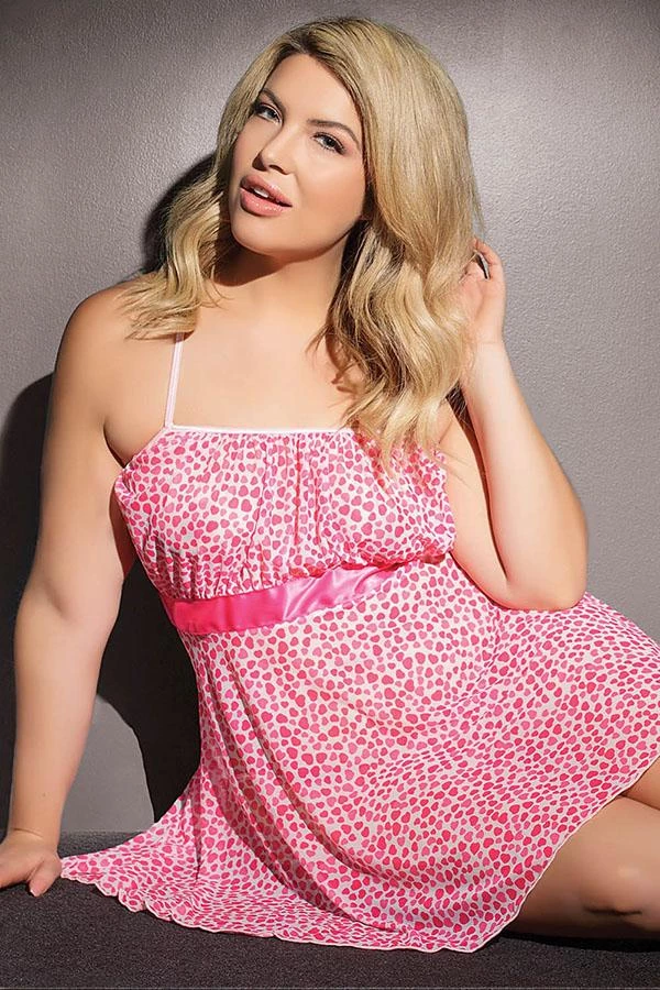 Pretty in pink! Flirty heart print babydoll & g-string set with gathered bust detail and criss cross straps.