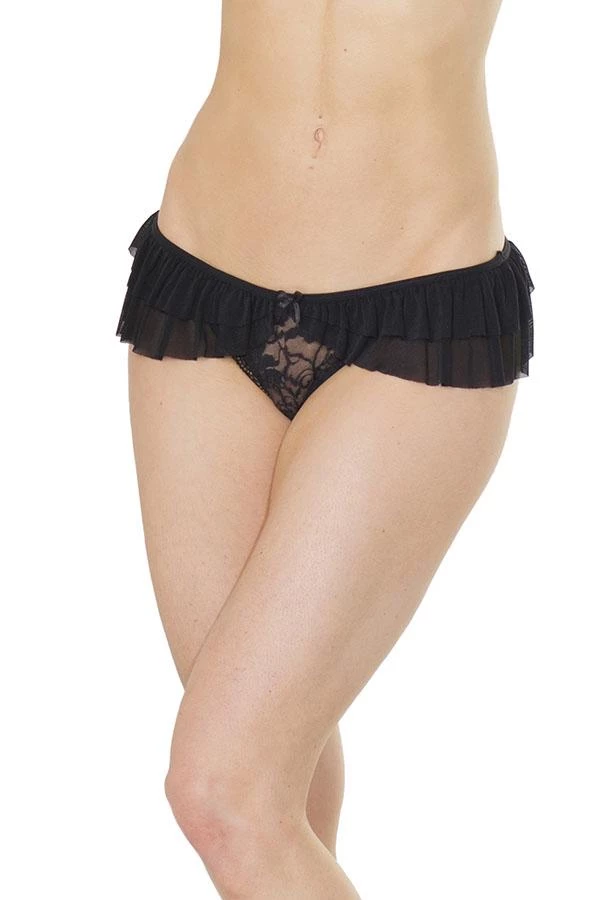 The ruffle mesh detail brings up the sweet factor to these super sexy crotchless panties.