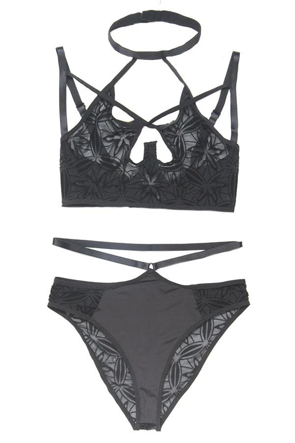 Super sexy bra & panty set with halter neck design, underwire cutaway cups, criss-cross strap details and full back panty.
