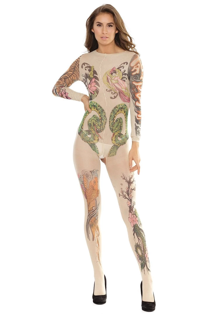 Gorgeous tattoo print long sleeve sheer nylon crotchless body stocking. G-string not included