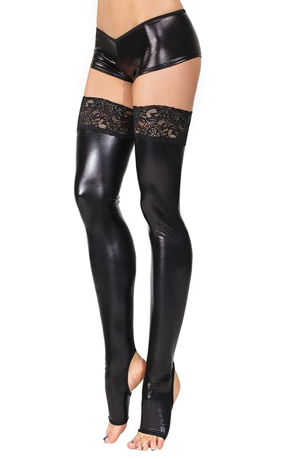 Super sexy toeless wet look stockings with scalloped lace silicone grip tops.
