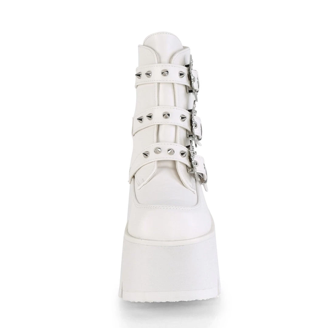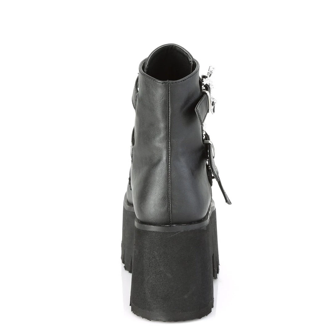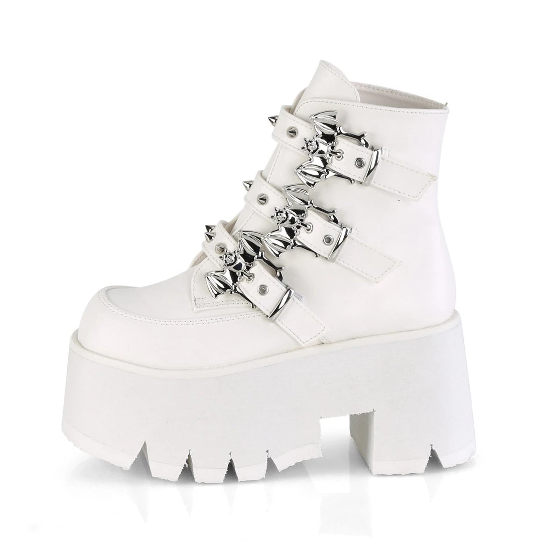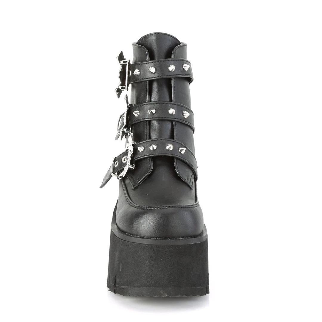 Fun & funky 3 1/2″ (90mm) chunky heel cut out platform ankle boot featuring 3 studded bat buckle straps.