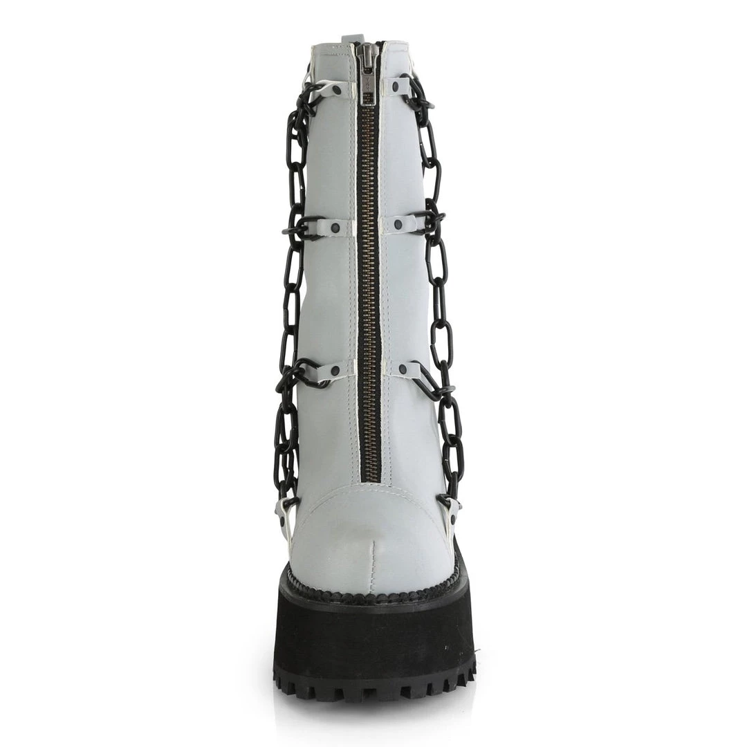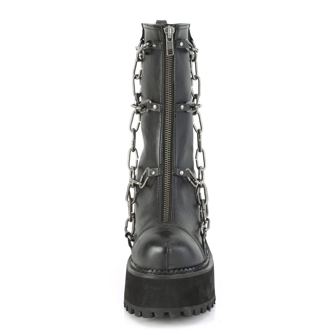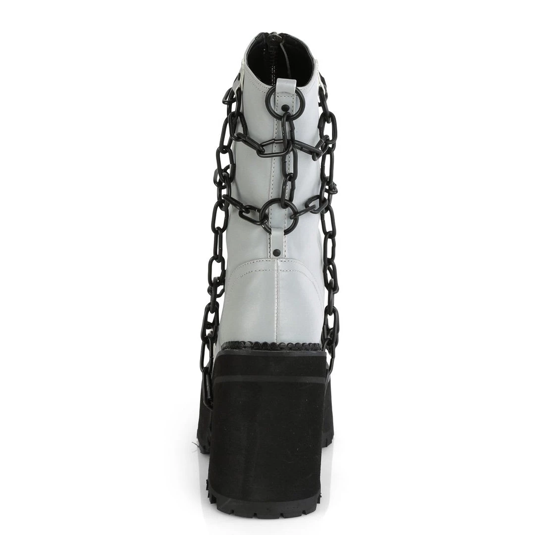 Stomp around in these 4 3/4″ (121mm) block heel, 2 1/4″ (57mm) cleated platform ankle boots featuring metal cage chain detailing on the vamp and full front metal zip closure.