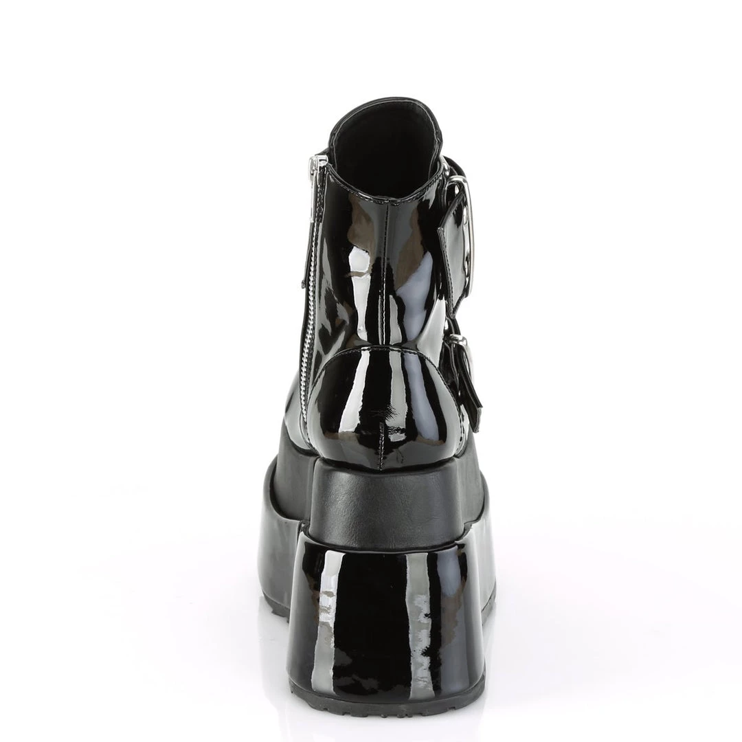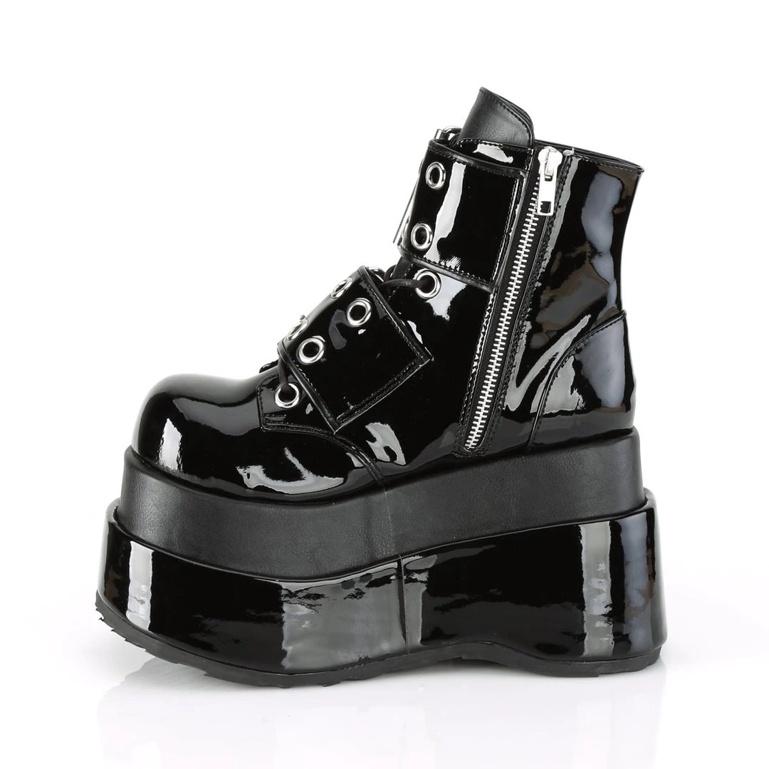 Cool 4 1/2″ (114mm) tiered platform lace-up front ankle boot featuring double grommet buckle straps with inside zip closure for easy wearability.