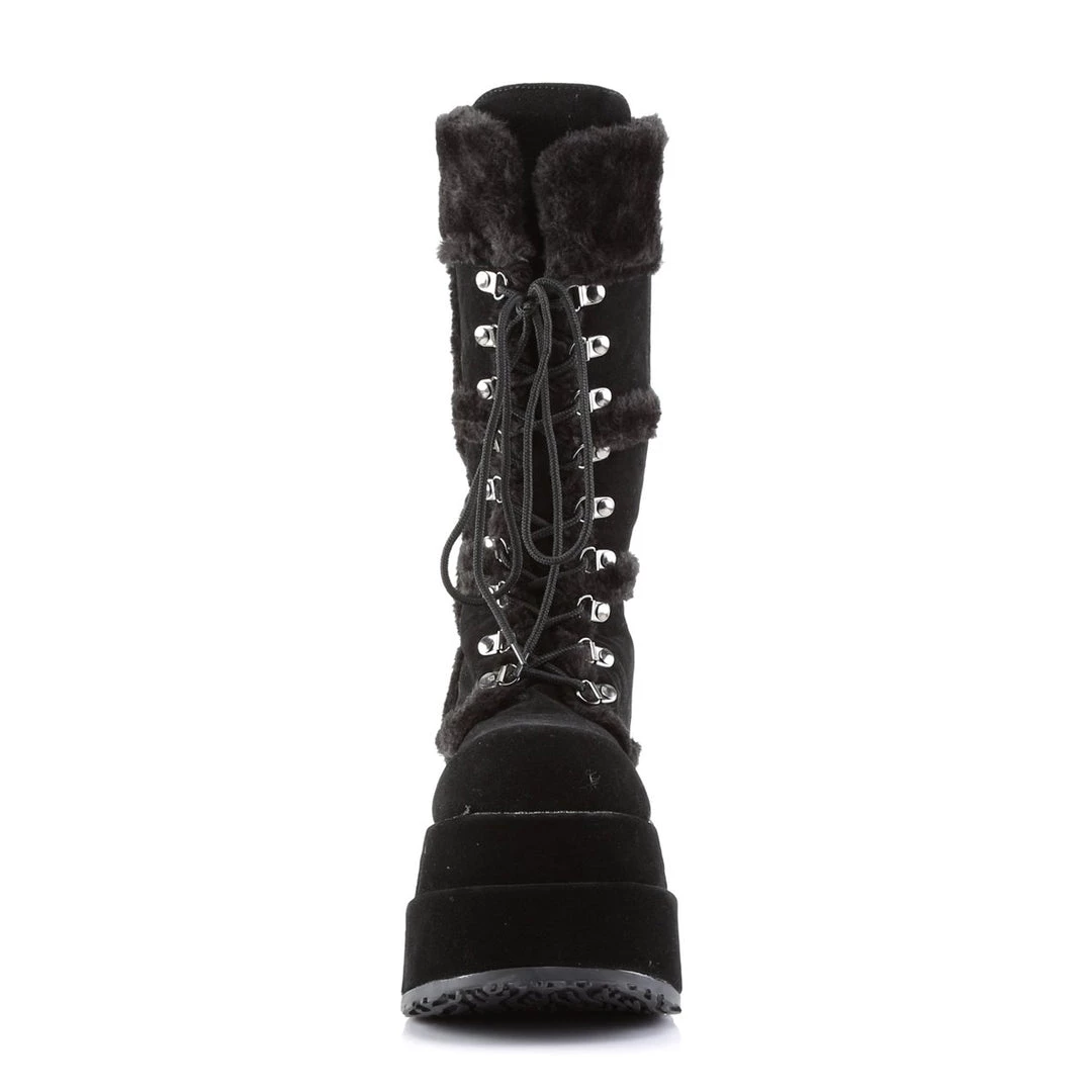 Faux shearling trim inside and out creates a wildly fabulous silhouette, as will the sky-high platform. Toe-to-shaft lacing includes riveted eyelets for added tough-chic shine. Swell platform boots featuring a high platform bottom, a suede upper adorned with faux fur and laces and a side zipper for a comfortable fit.