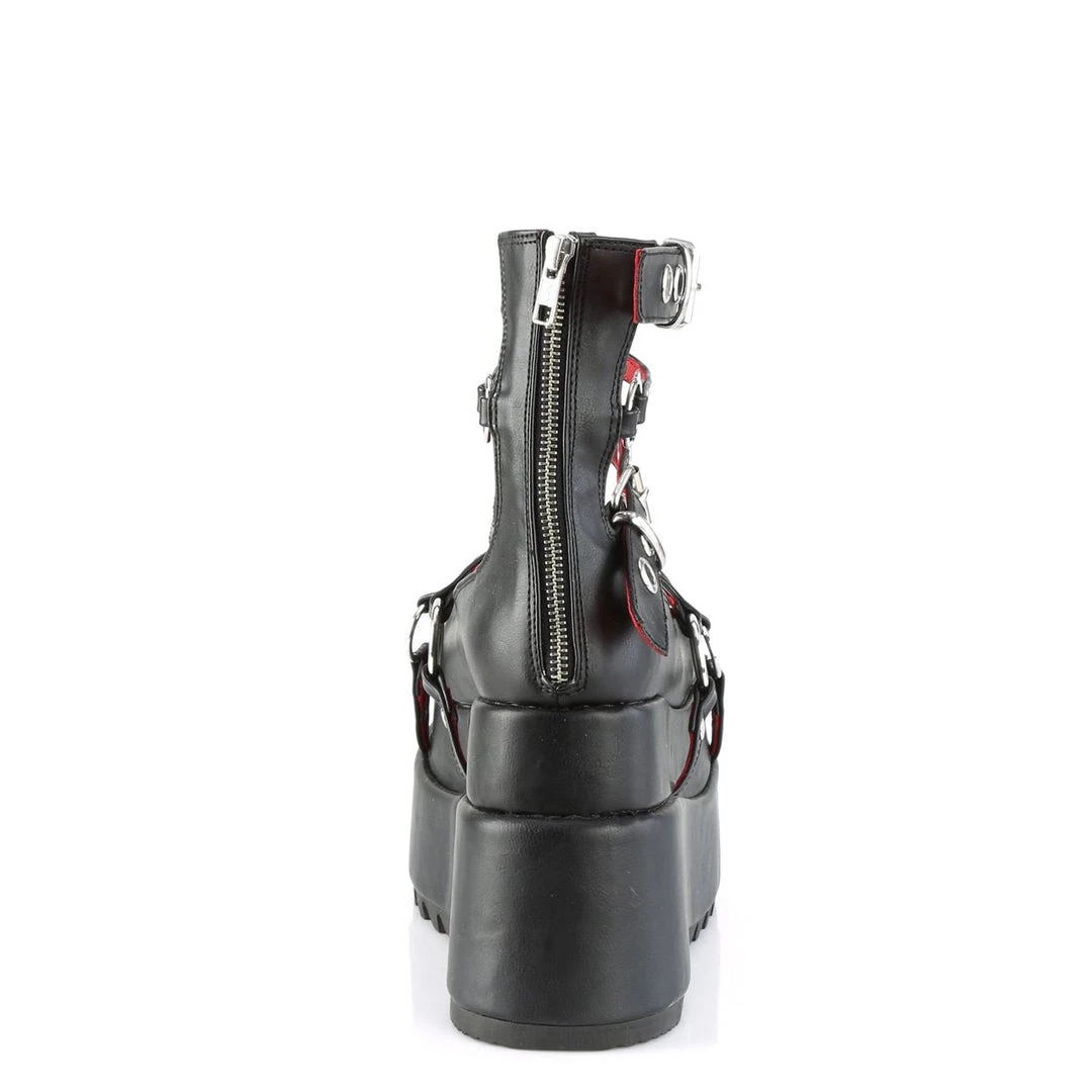 Funky 4 1/2″ (114mm) tiered platform cage bootie featuring buckle straps, O-rings & studding details with metal back zip closure.