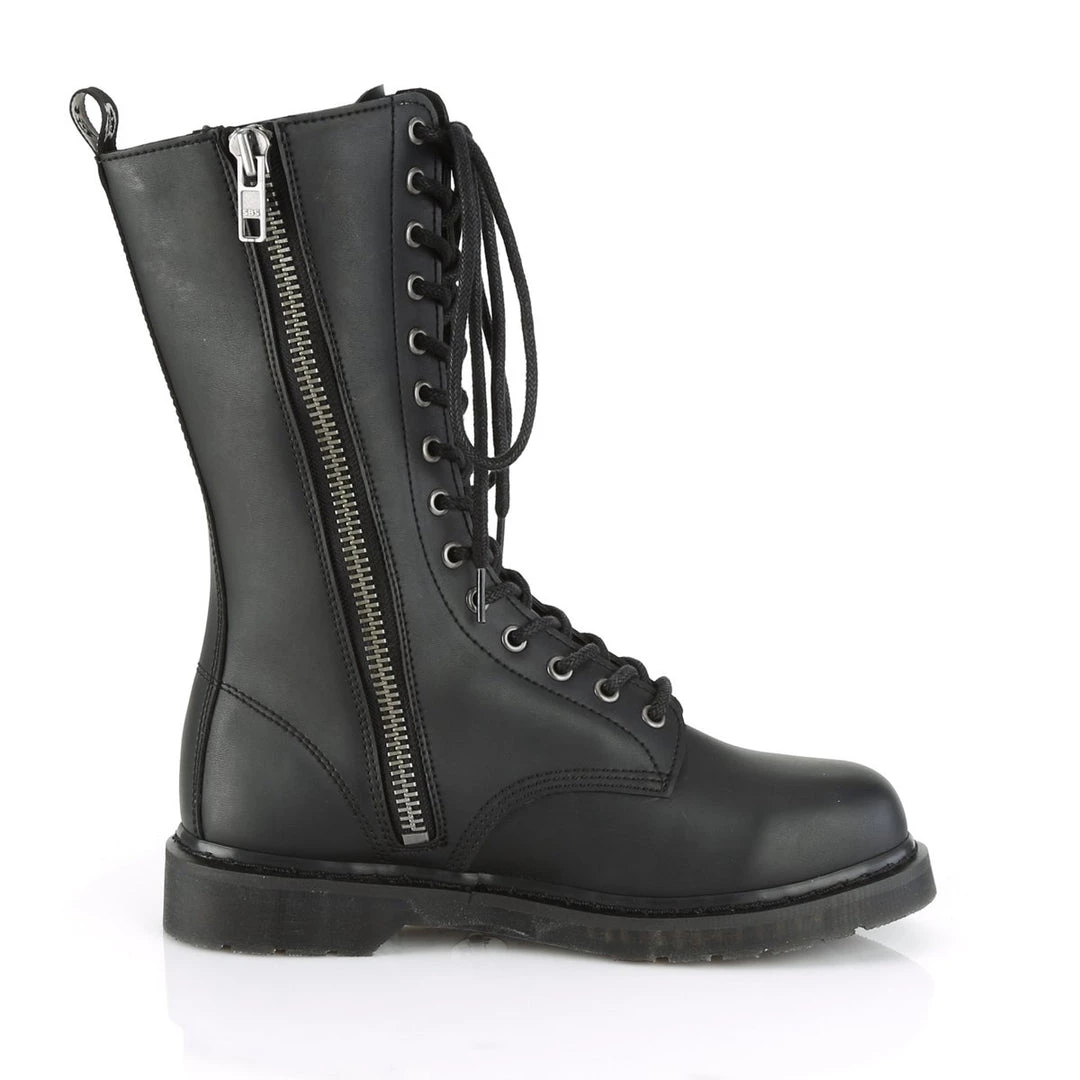 The classic combat boot. Sturdy, with style 1 1/4″ (32mm) stacked flat heel 14-eyelet lace-up mid calf unisex vegan boot with back pull-tab and inside zip closure for easy wear and go.
