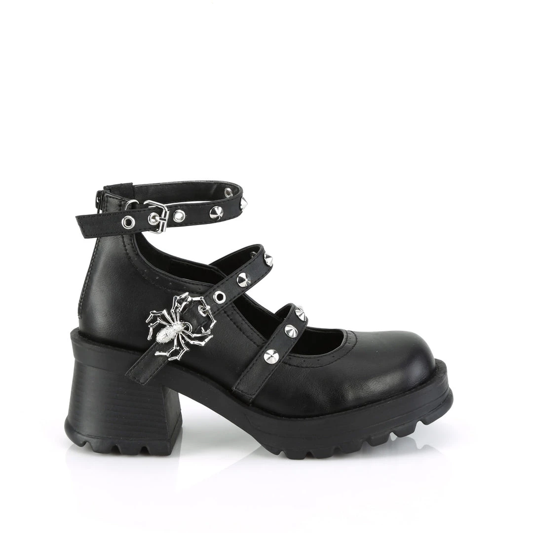 You can never go wrong in this spooky yet stylish shoe that features 2 3/4″ (70mm) chunky heel, 1″ (25mm) platform triple strap Maryjanes featuring spider buckle middle strap, hook n’ loop instep strap & cone stud details, metal back zip closure.