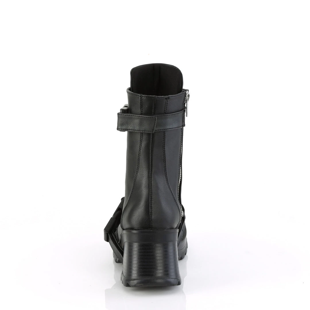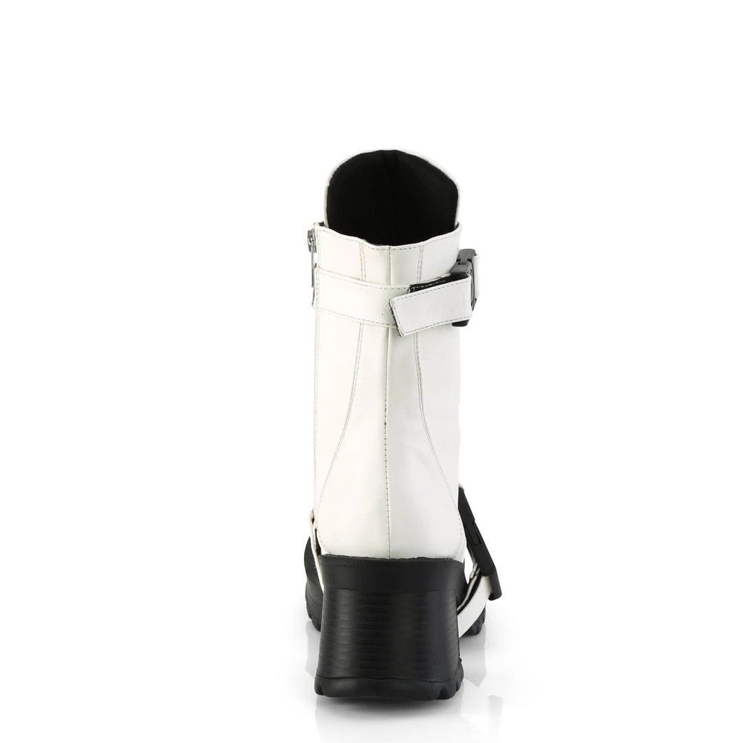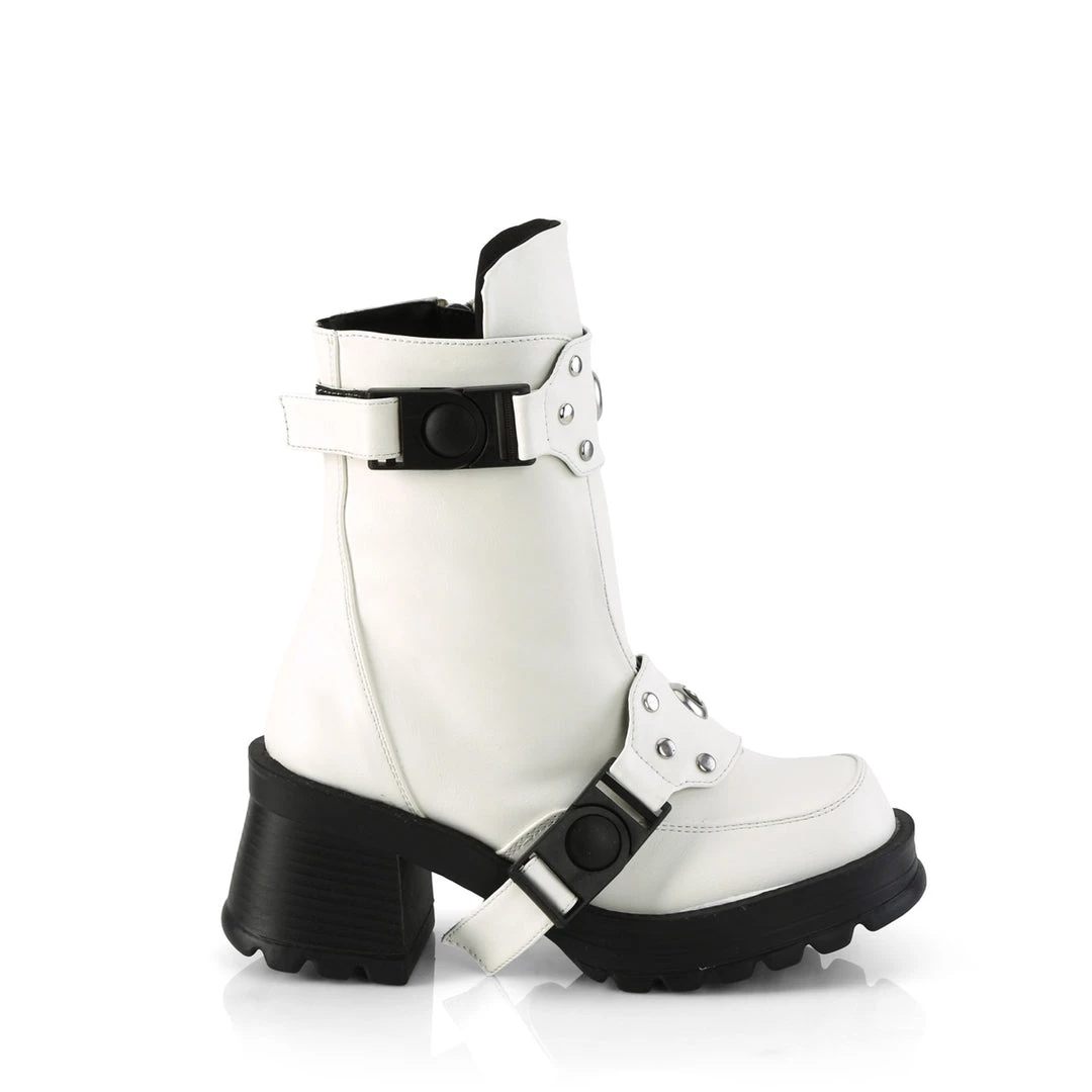 A new pair of boots like this can make your mood better! A 2 3/4″ (70mm) chunky heel, 1″ (25mm) platform ankle boot, featuring eyelet and studded straps w/ quick release plastic buckle, inside metal zip closure.