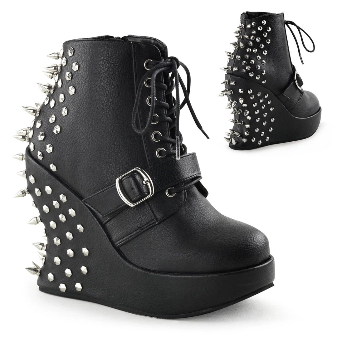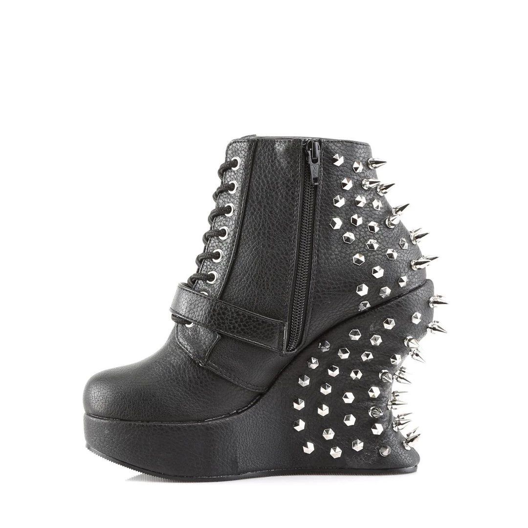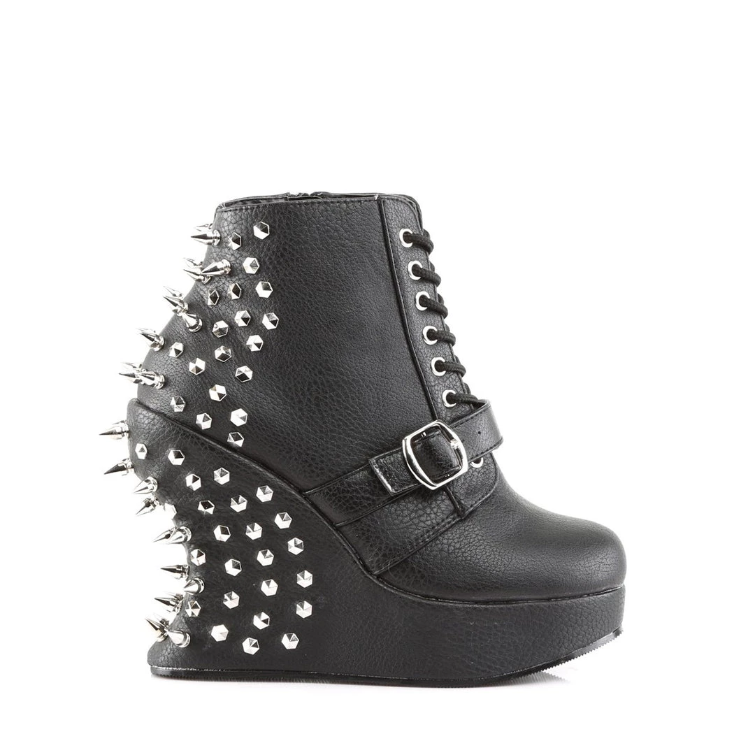 5″ Wedge Platform, Lace Up Ankle Boot With Spike Stud Embellishment Along the Back & Heel, Side Zip.