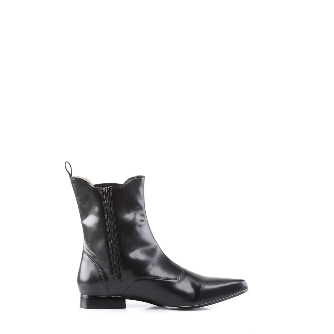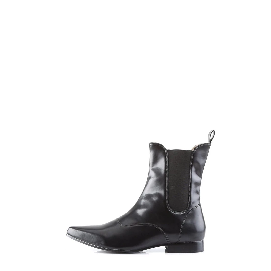 This flashy pointed toe boot features a slight heel and a Chelsea boot design. This sharp look is sure to add some flash to any look. The elastic sides and side zipper make this shoe easy to get on and off.