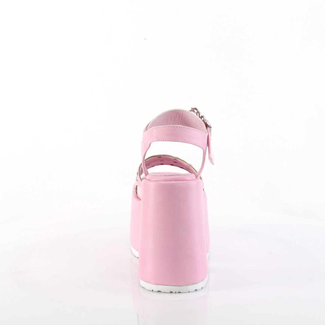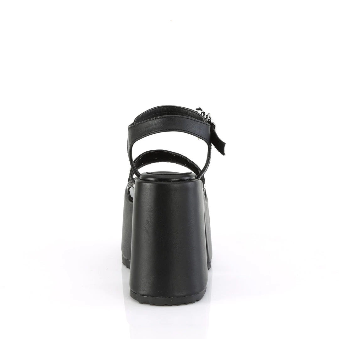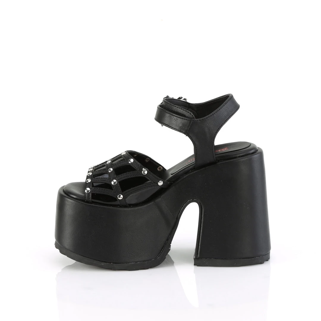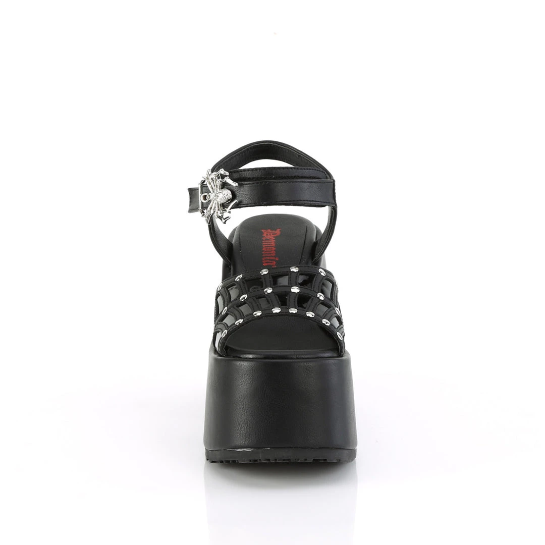 A pair of these spooky and gutsy sandals that can go with any outfit, is what you need! A 5″ (127mm) chunky heel, 3″ (76mm) platform ankle strap sandal featuring silver-tone spider-shaped buckle at the strap, silver studs, and spider web detail on vamp.