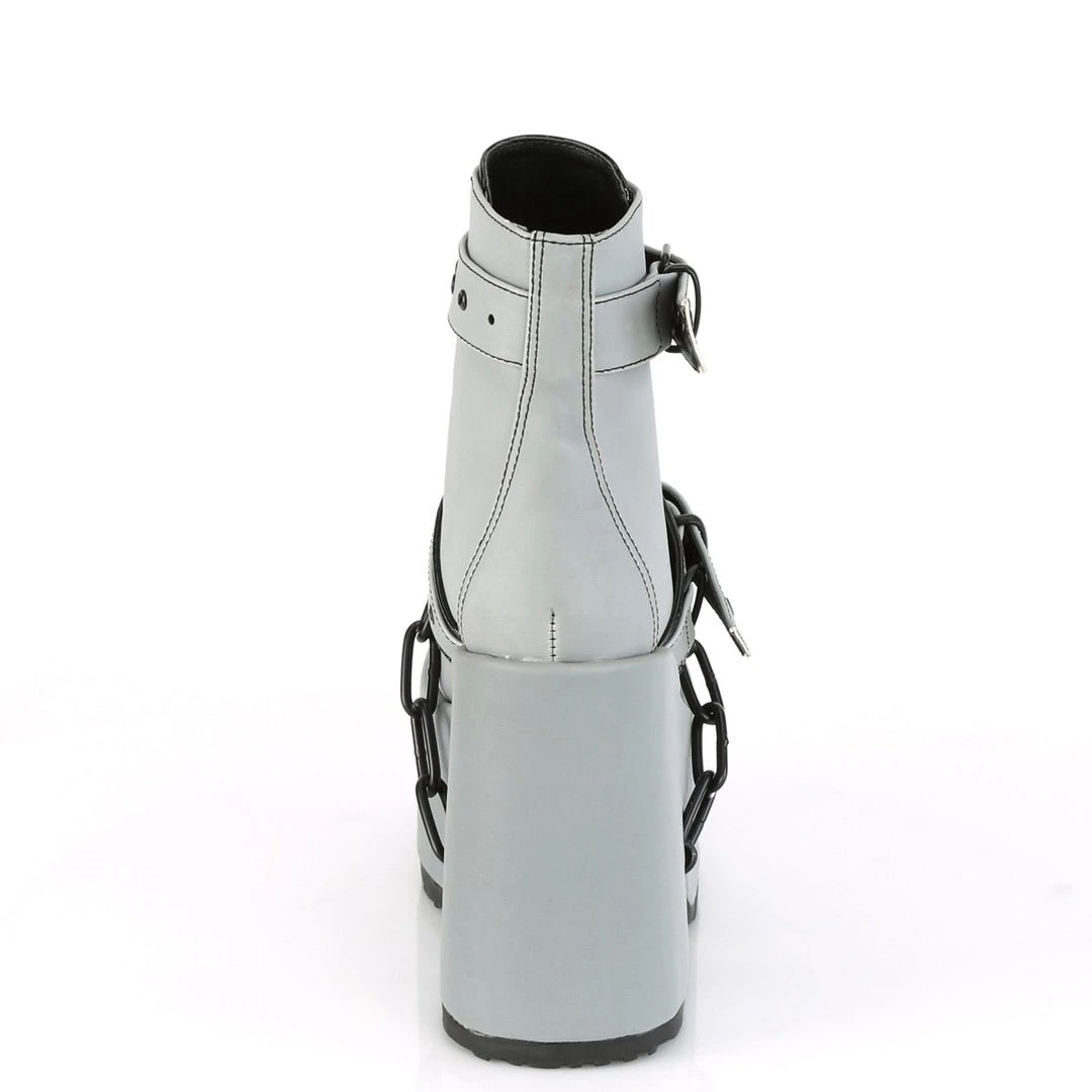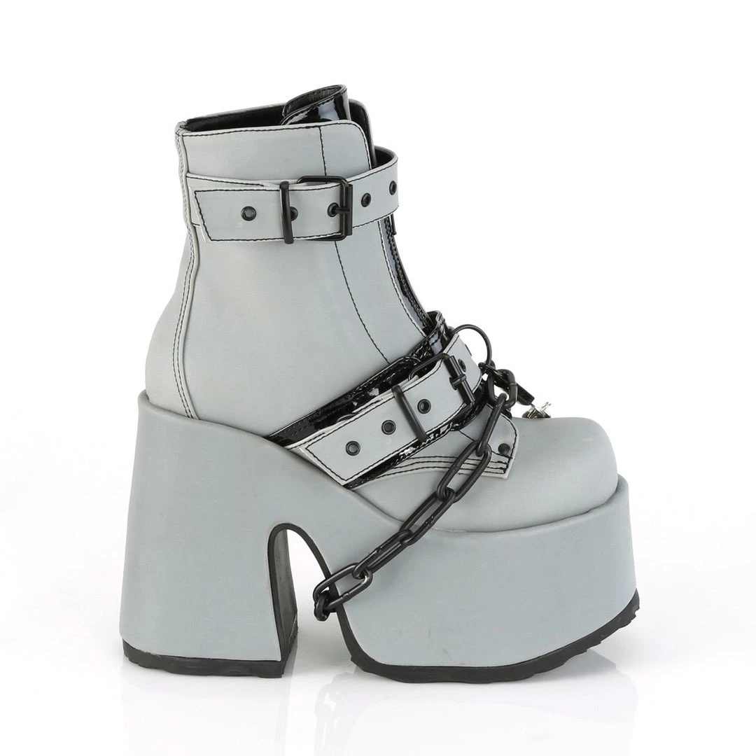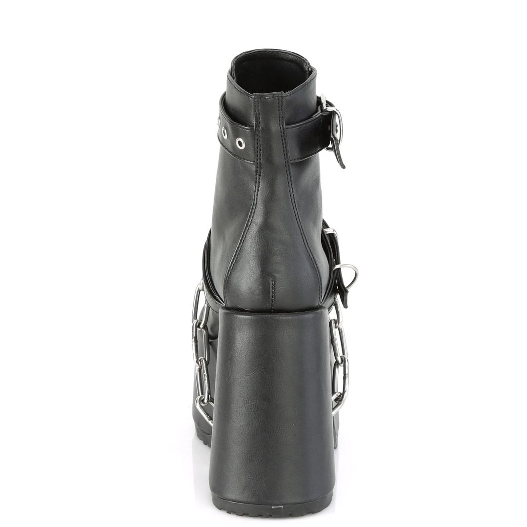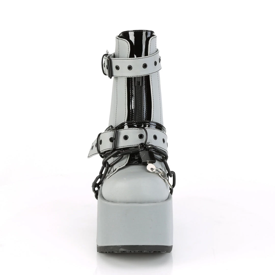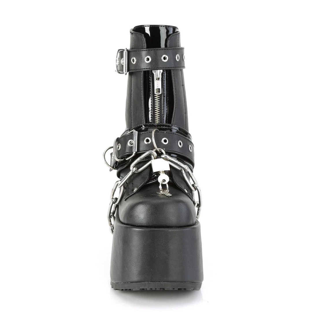 Funky 5″ (127mm) chunky heel, 3″ (75mm) platform ankle boot with metal front zip closure featuring top buckle strap with eyelet & lower buckle strap with eyelets, D-ring & chrome metal plated padlock with thick metal chain draped through platform and heel channel.