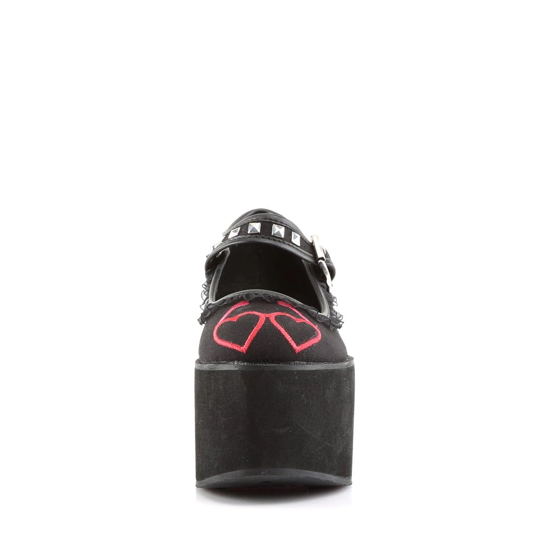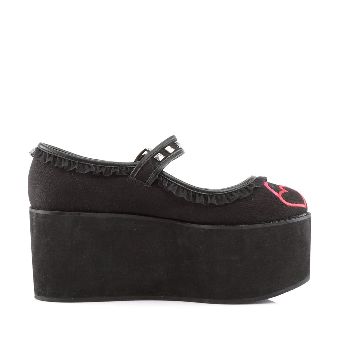 This chunky Mary Jane is the perfect gothic platform. 3 1/4″ PF”(7cm) Platform Mary Jane Featuring Embroidered Heart Eyeglasses on Vamp, Ruffle Lace Trim, and Pyramid Studs & Piping Detail