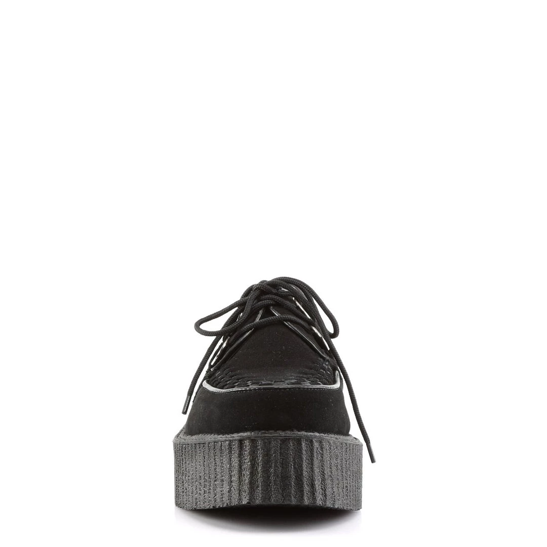 An underground style staple gets the Pleaser treatment. This classic creeper design features woven accents at the toe and an extra-high platform for a bolder silhouette. Black Suede Platform Creepers with low platform, crossover laces and checkered pattern.