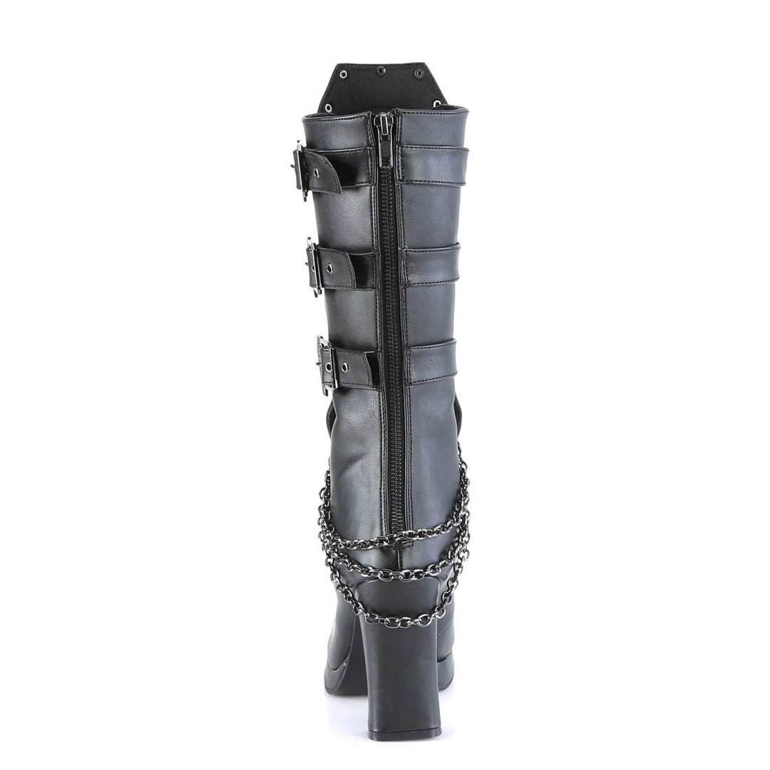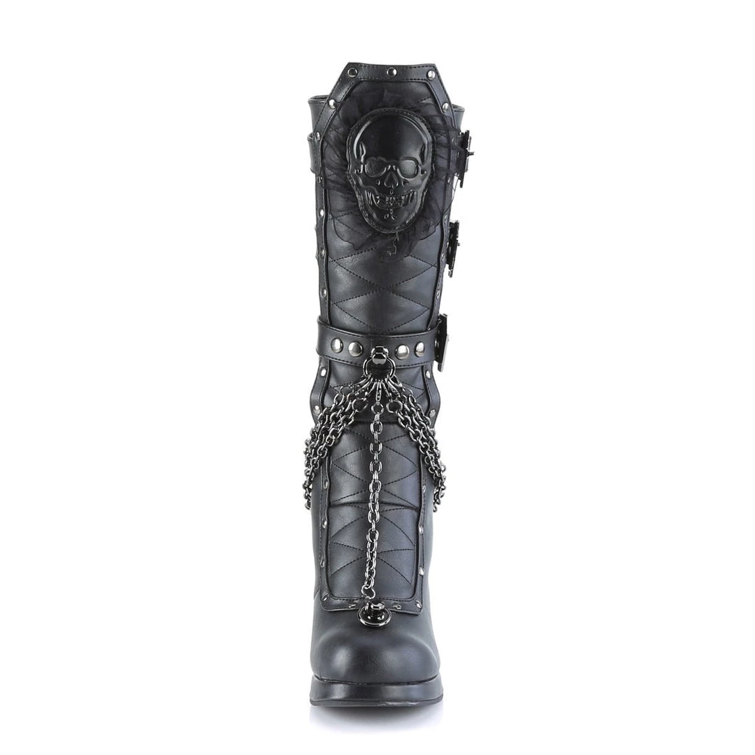 Gorgeous 4″ (102mm) block heel, 3/4″ (19mm) platform mid-calf boot with coffin buckle straps, skull patch & lace embelished quilted front panel with studs & swivel hook cascading chain detail and metal back zip closure.