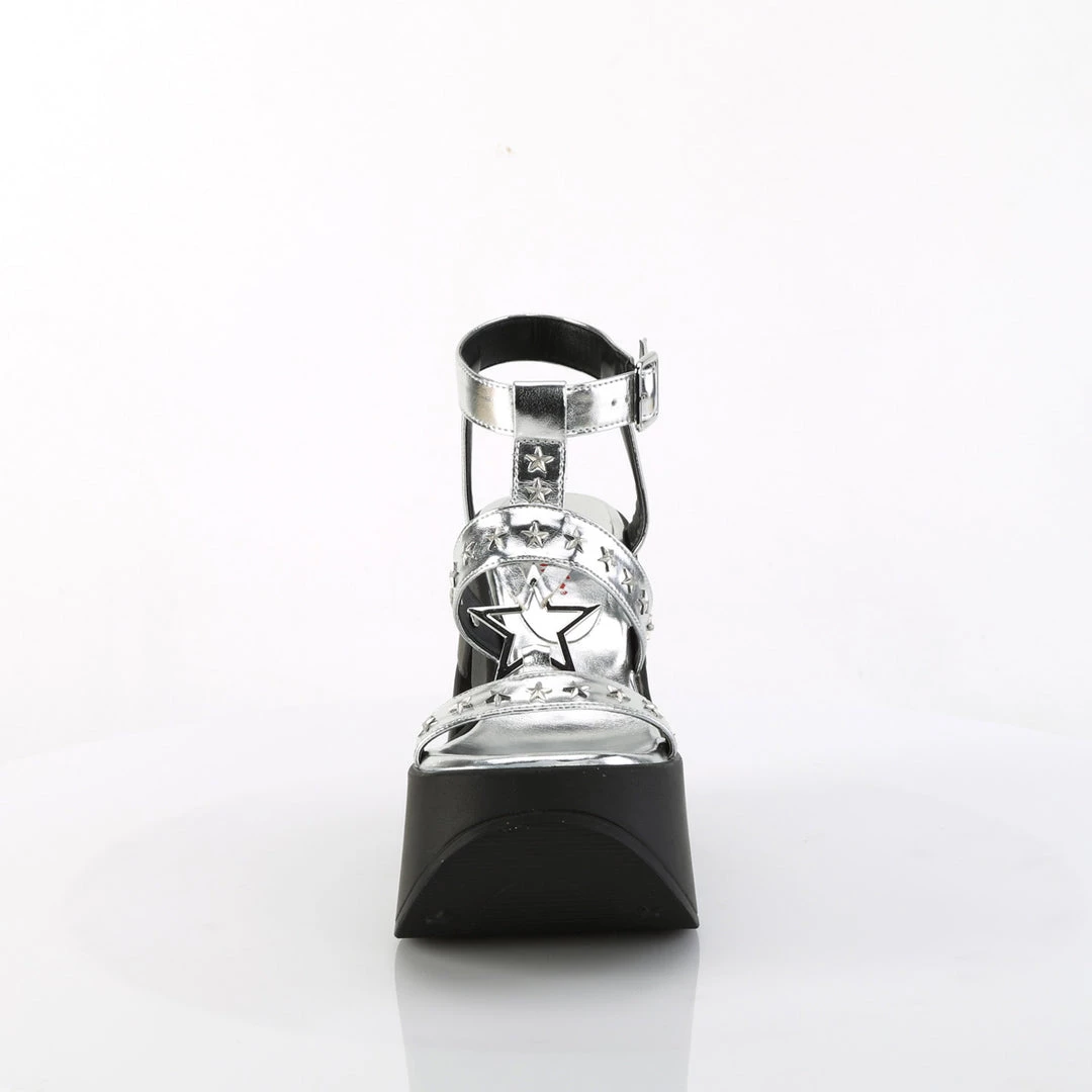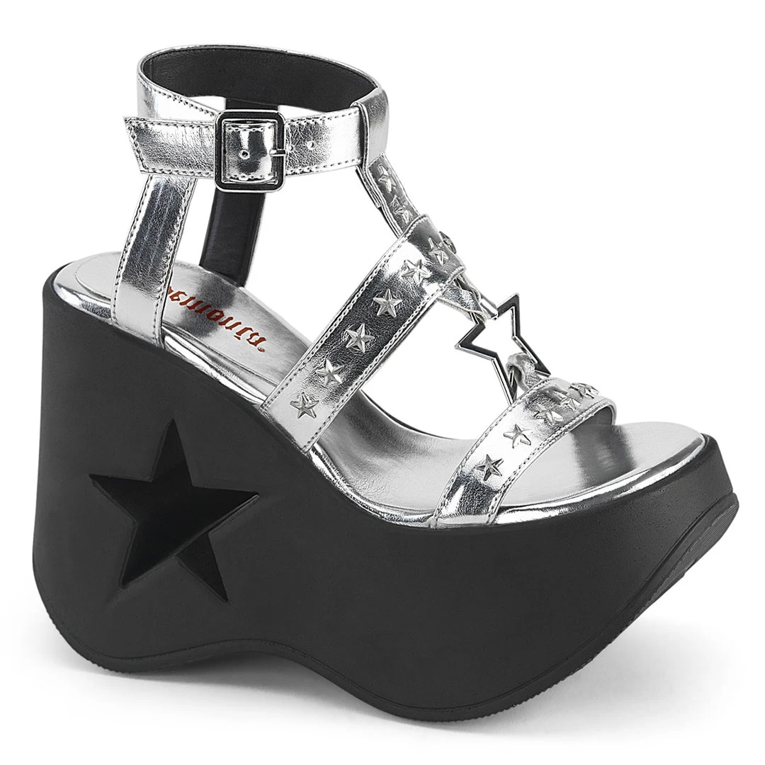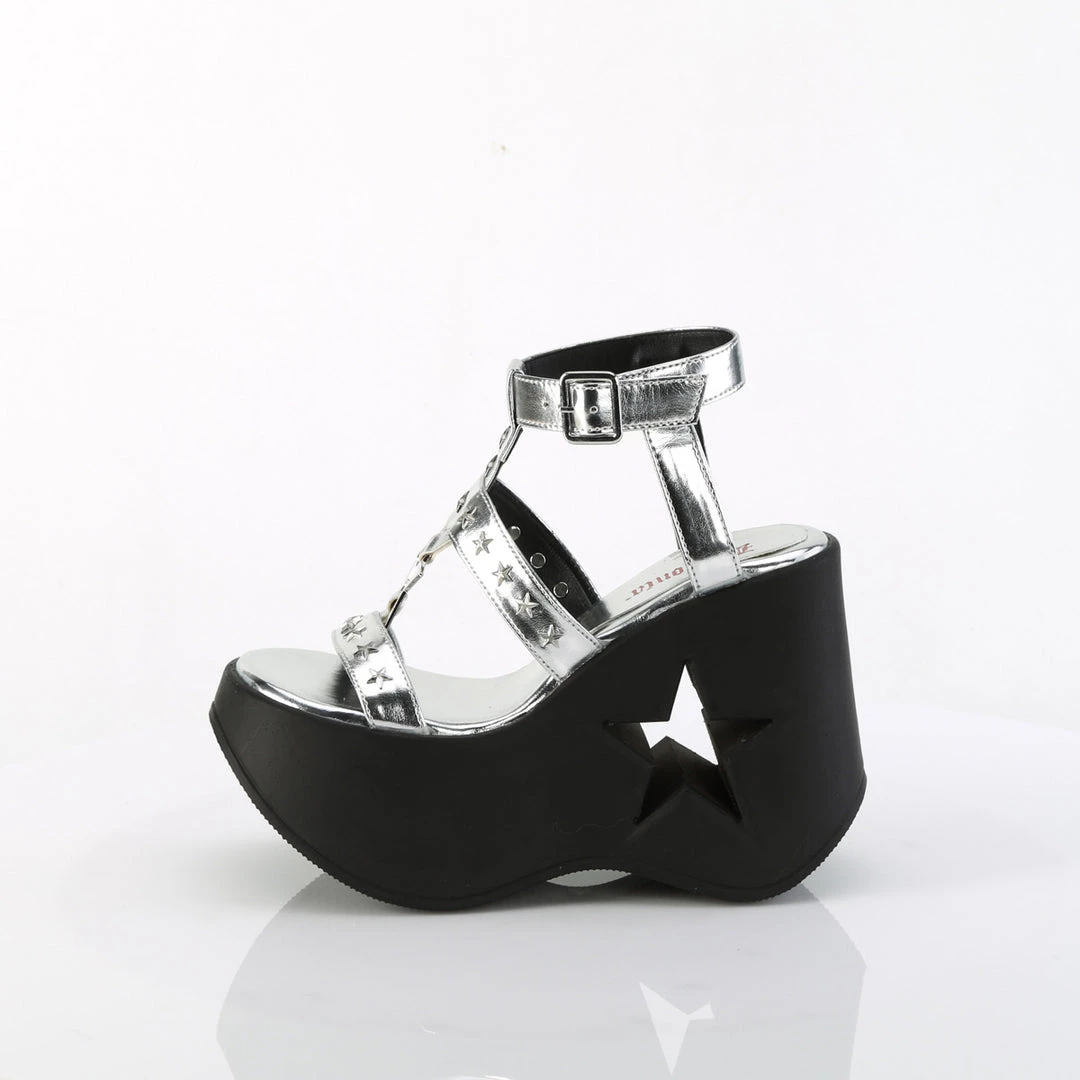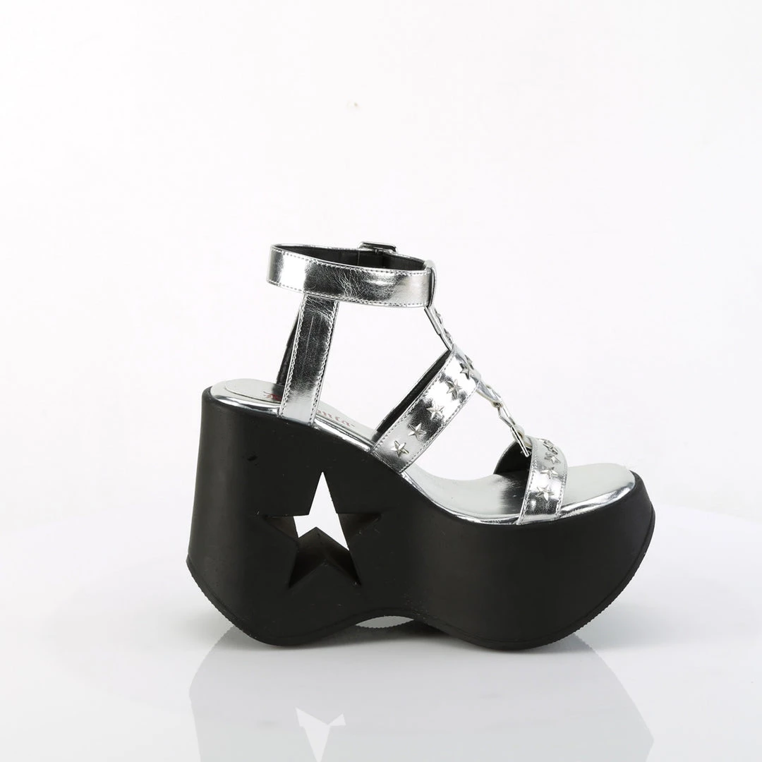 Be the spotlight from the crowd and rock this 5″ (127mm) star cutout platform wedge wrap-around ankle strap strappy sandal, featuring silver-tone star-studded straps and star ring detail.