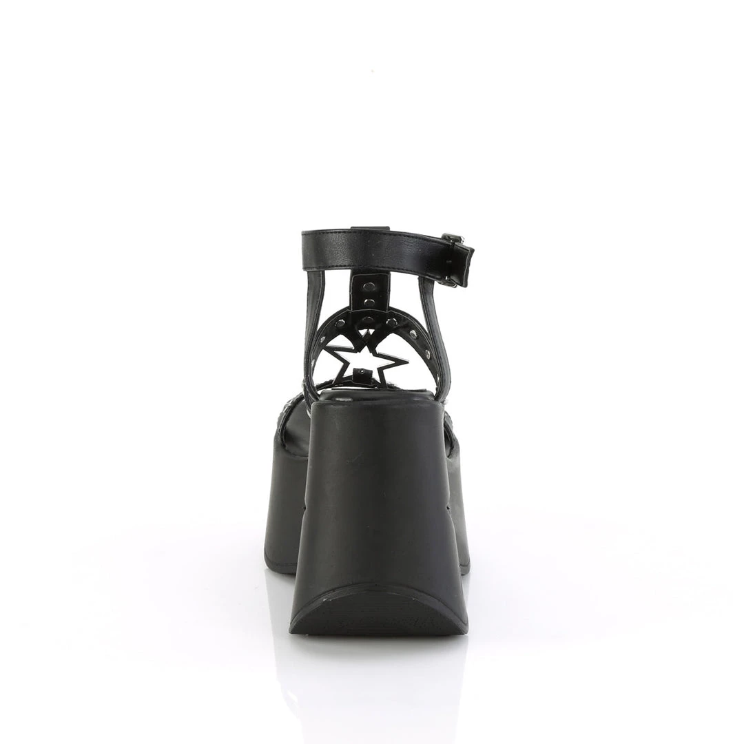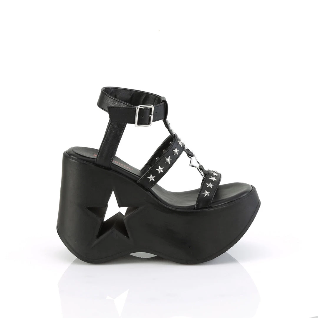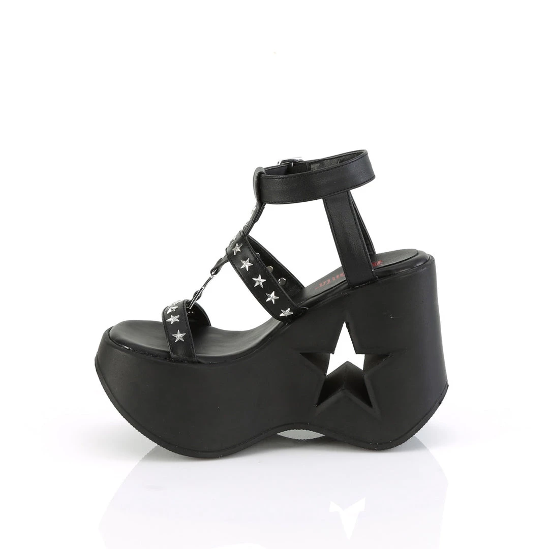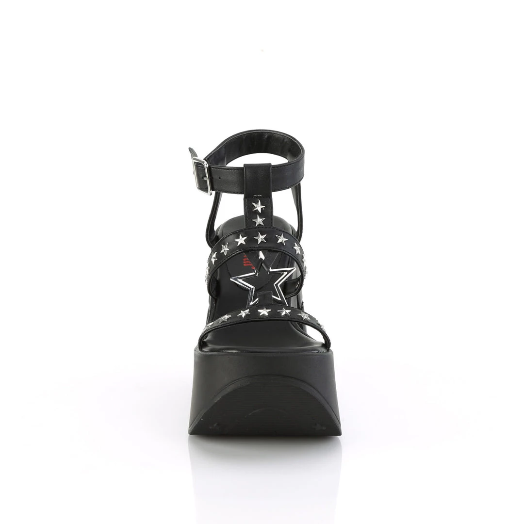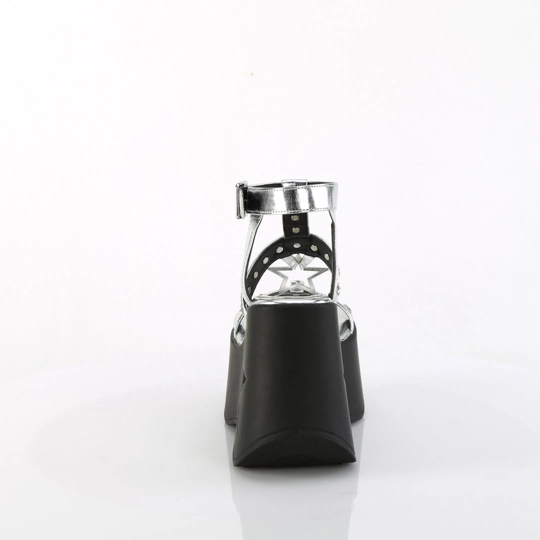 Be the spotlight from the crowd and rock this 5″ (127mm) star cutout platform wedge wrap-around ankle strap strappy sandal, featuring silver-tone star-studded straps and star ring detail.