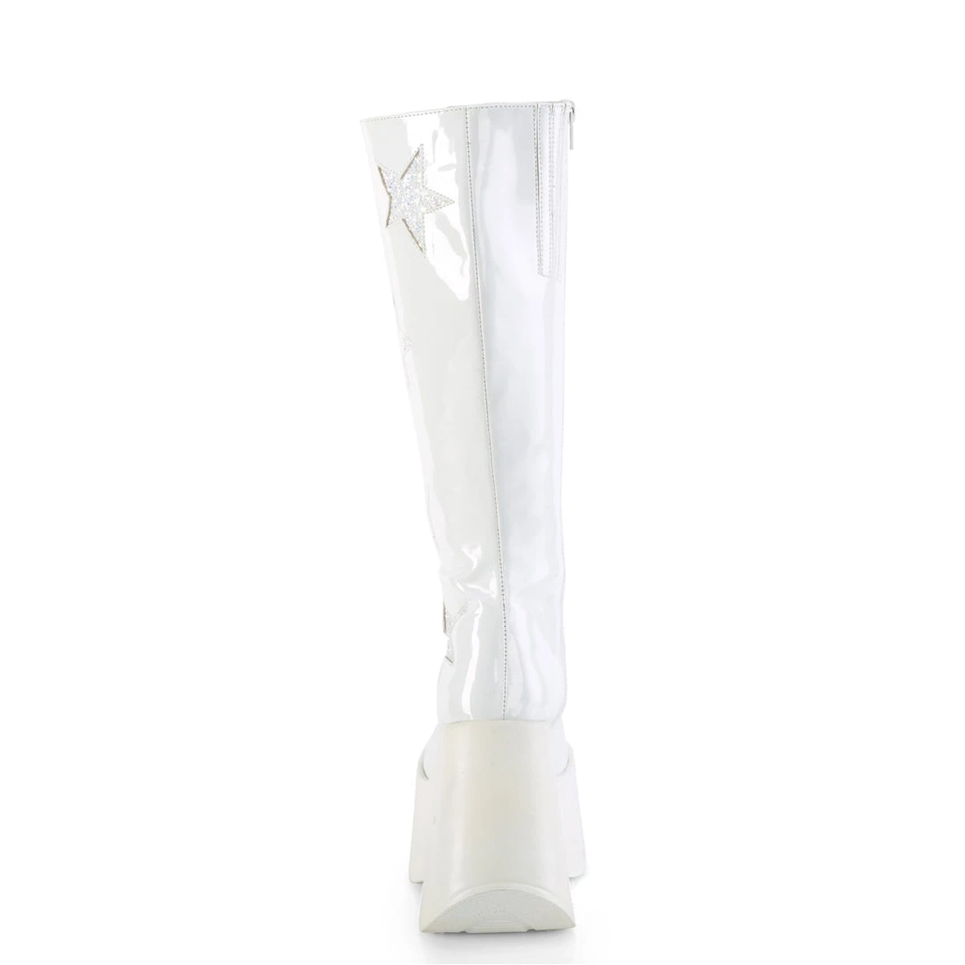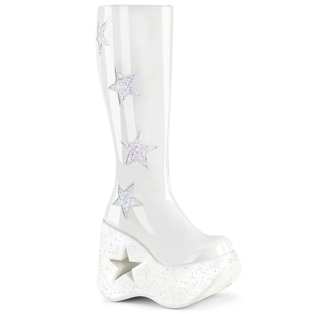 Wear it and feel like a superstar ready to own the stage! A 5″ (127mm) star cutout platform wedge knee-high boot featuring glitter star details on the outer shaft & mini iridescent glitter on the entire platform bottom, inside metal zip closure.