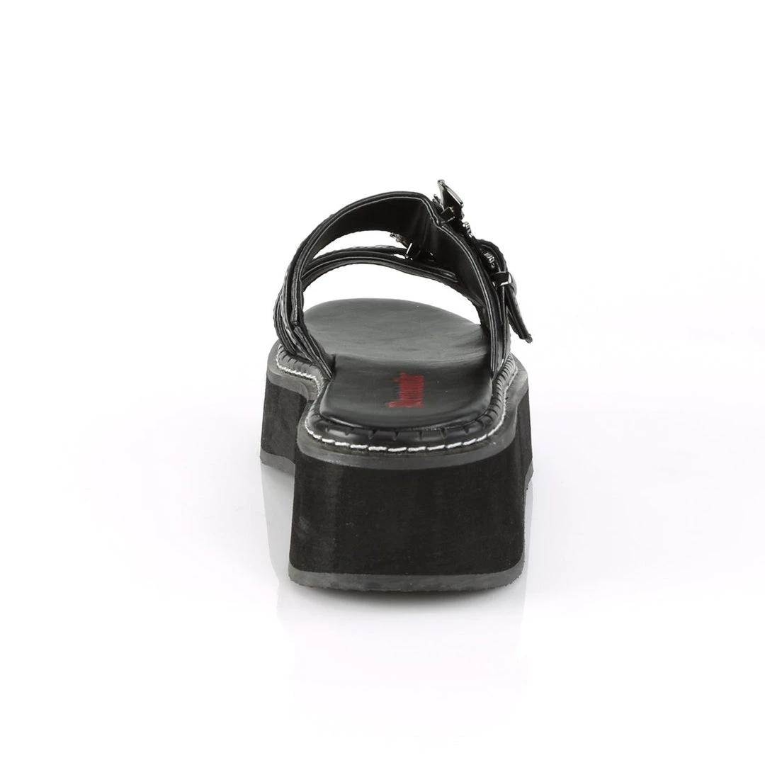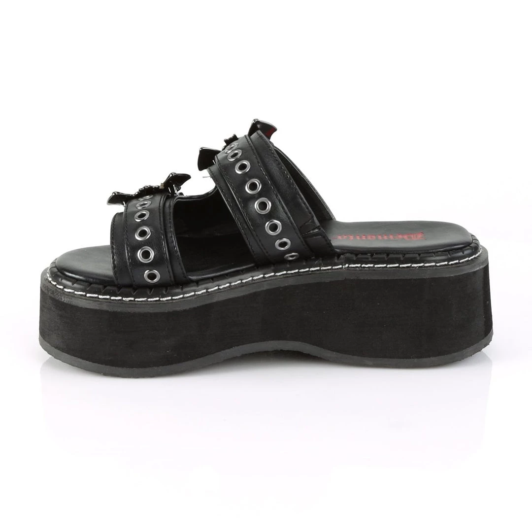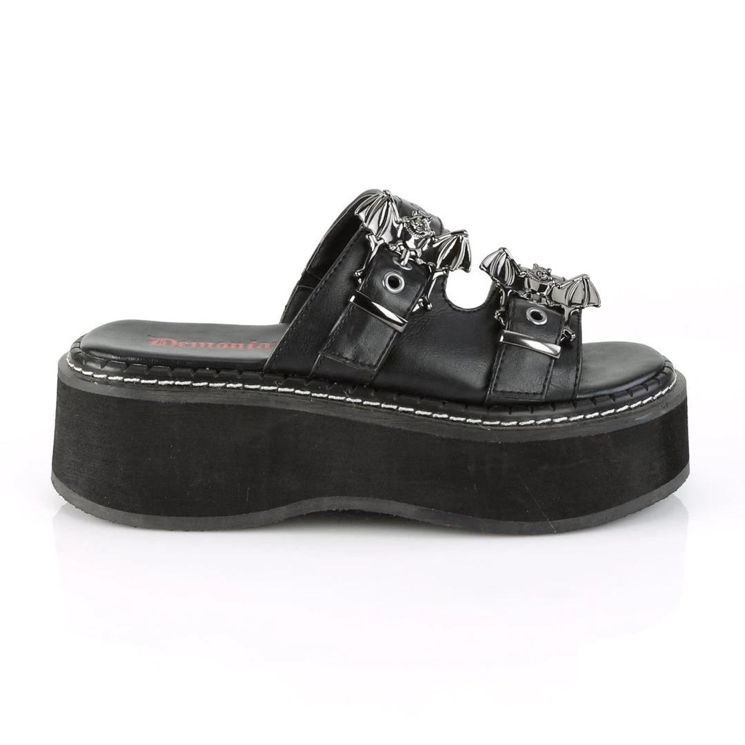 Goth style 2″ platform double strap slide sandal featuring riveted straps and ornamental bat buckles
