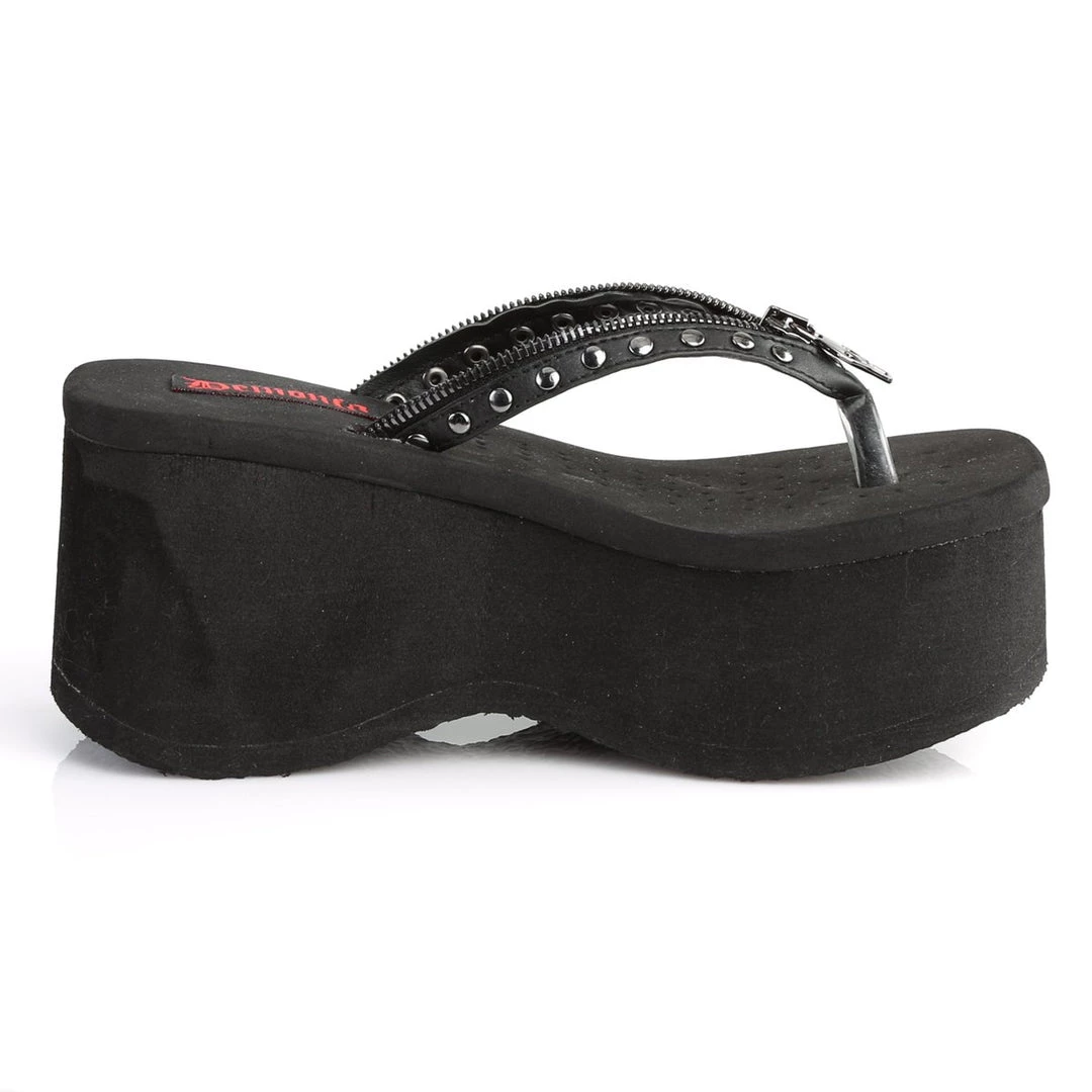Fun and easy to wear 3 1/2″ (89mm) platform studded thong sandal featuring ornamental zipper trim with skull zipper head