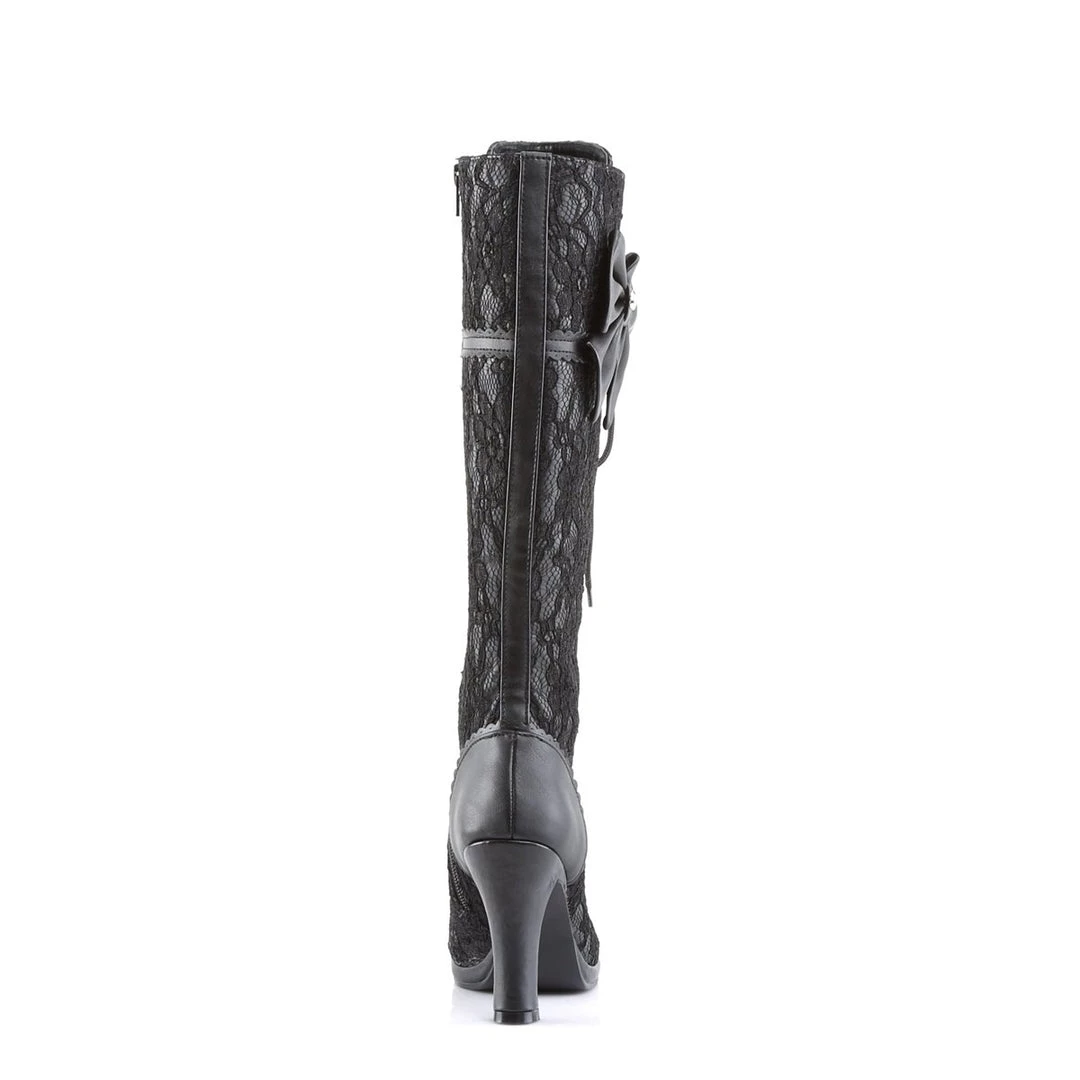 This knee high Victorian inspired boot has a combination of materials and an elegant lace overlay that make this shoe romantic and classic. This lace up granny boot has a feminine bow detail and a side zipper that make this shoe easy to get on and off.