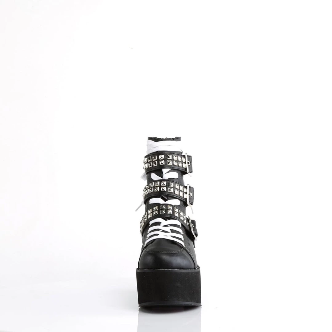2 3/4″(7cm) Platform Lace-Up Front Ankle Boot Featuring Multi Buckle Straps w/Pyramid Studs Detail and Interchangable Laces, Back Zip Closure