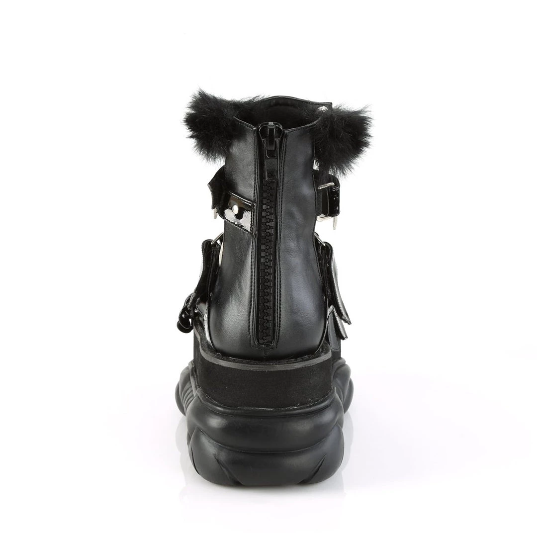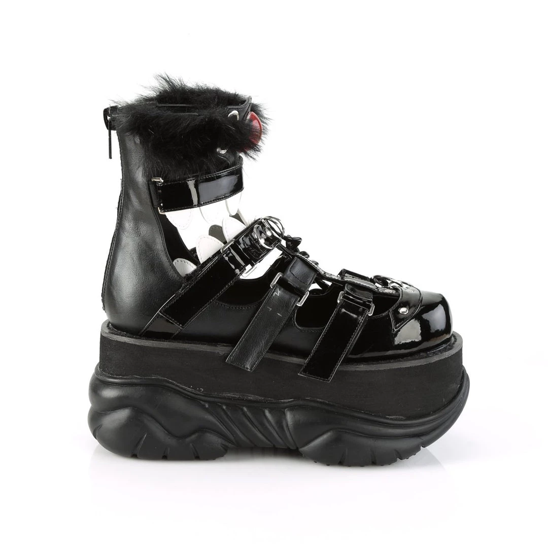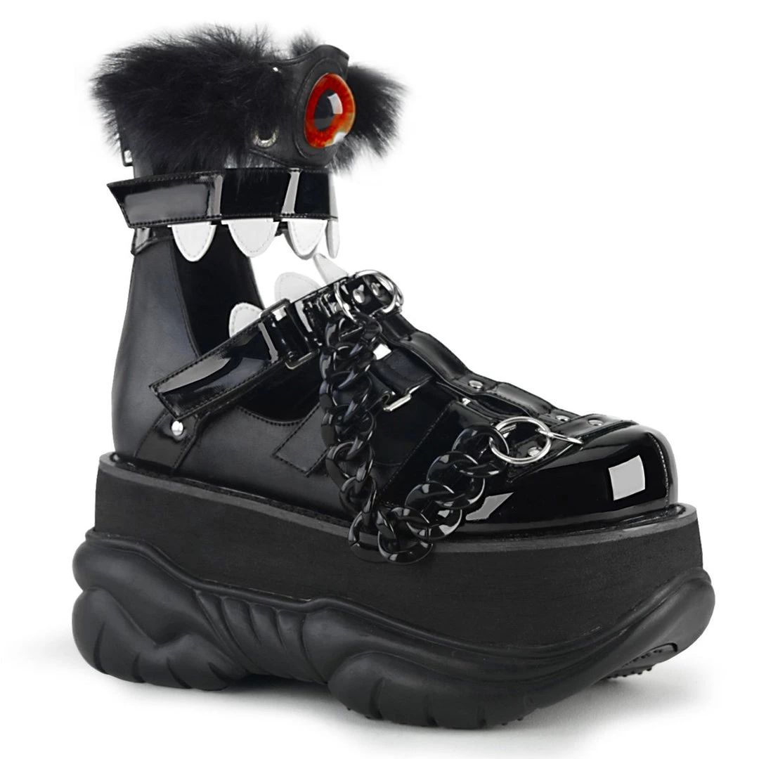 Get your freak on in these fun 3″ (76mm) platform cage style monster bootie sandals featuring faux fur collar with eyeball, mouth shape cut out with contrast teeth at ankle, and plastic hanging chain detail, back zip closure.