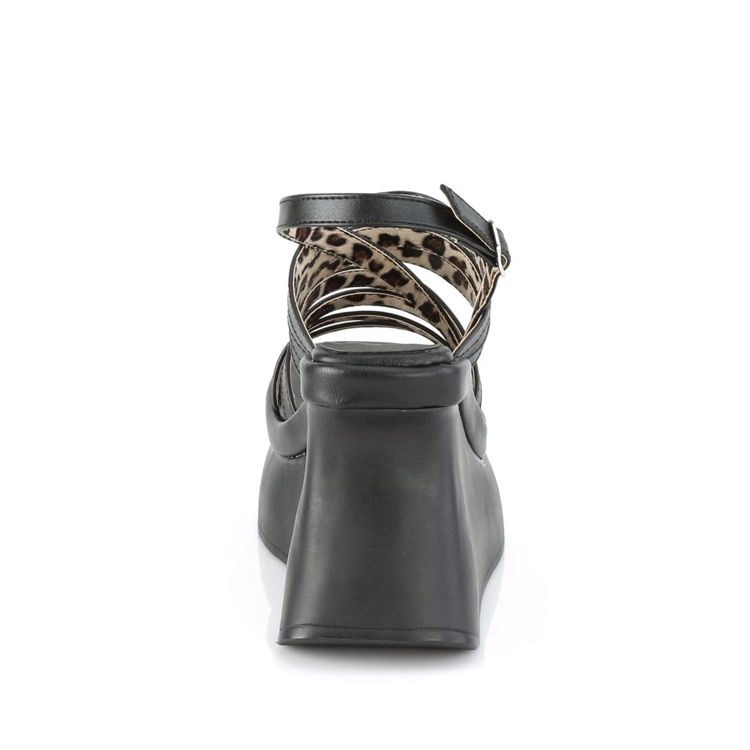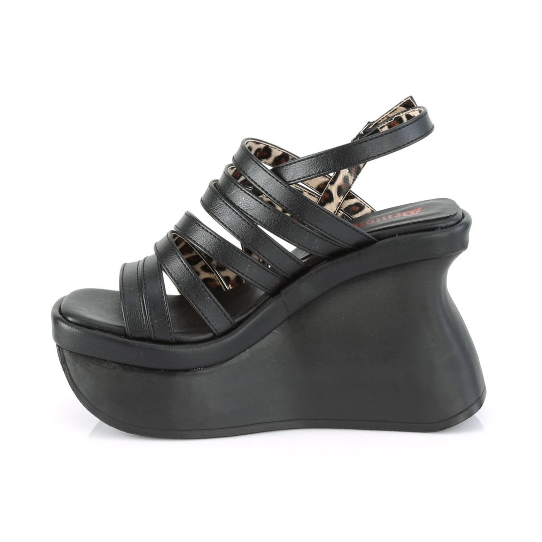 Funky & fresh 4 1/2″ (114mm) wedge strappy platform sandal featuring asymmetrical slingback straps.