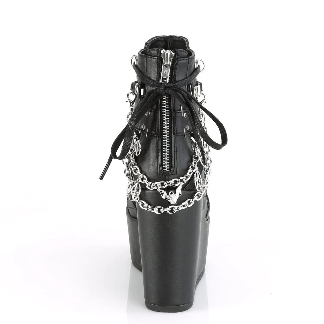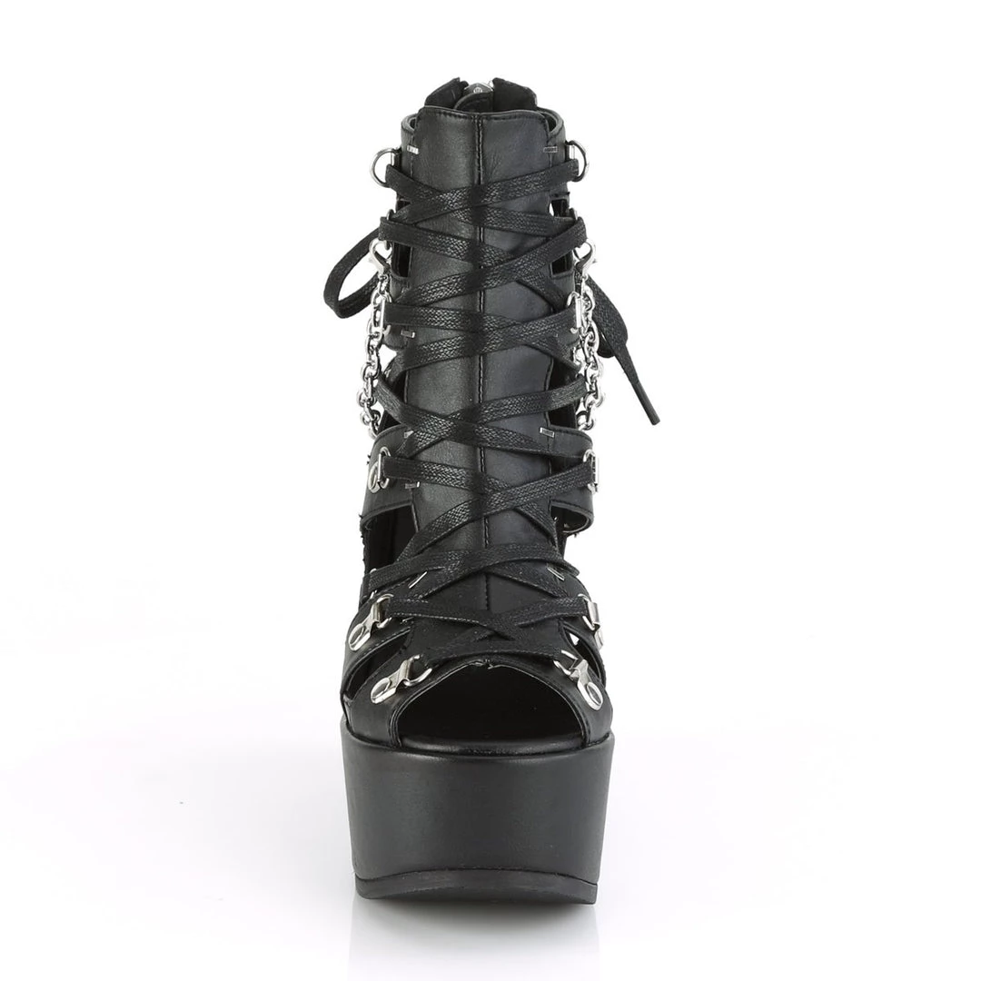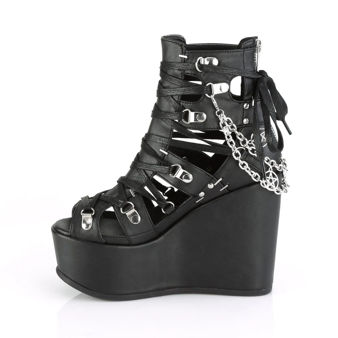 Funky boots with a distinct edge. 5″ (127mm) platform wedge peeptoe lace-up cage ankle bootie featuring silver tone metal staple accents, studs, D-rings & removable back chains with pentagram & bat charms and metal back zip closure.