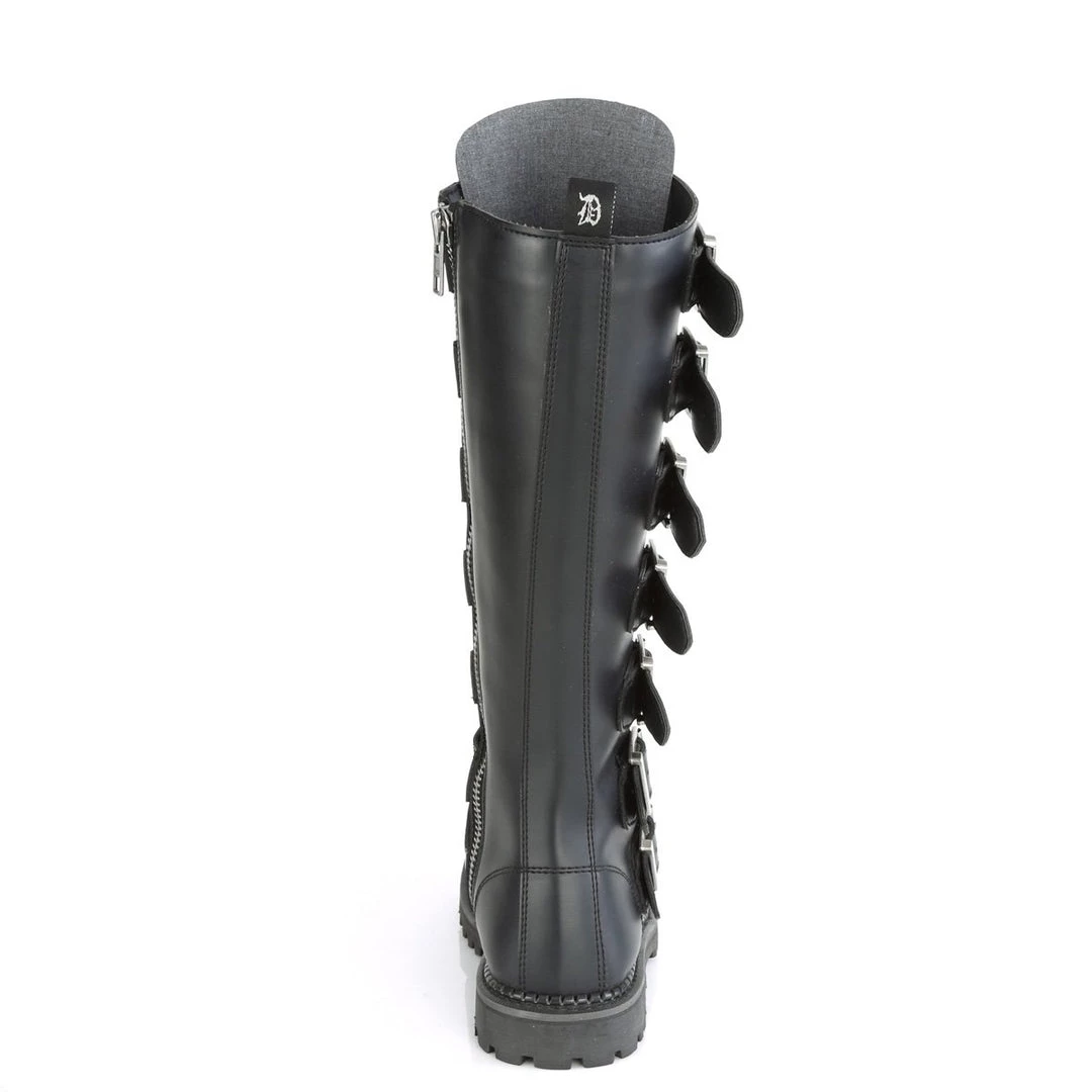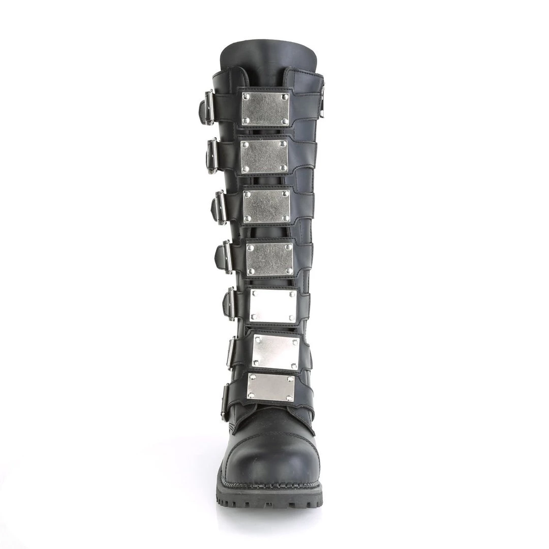 Demonia unisex vegan steel toe knee combat boot featuring multiple buckles & front metal plates, rubber sole and full length inside zip closure.