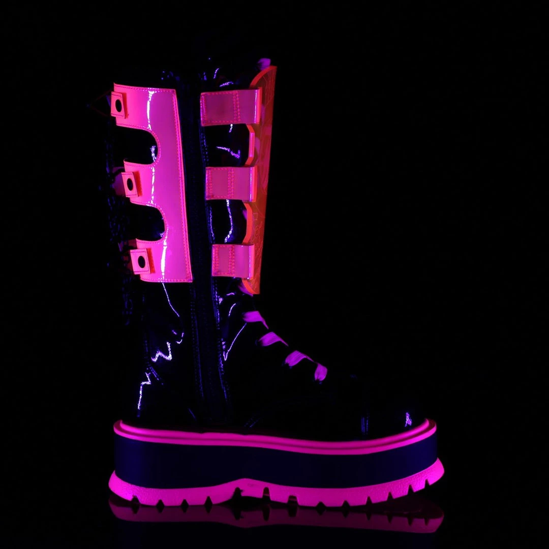 Stand out in the crowd. Funky 2″ (51mm) platform lace-up front mid-calf boots, featuring UV blacklight reactive acrylic shield with harness straps and pyramid ring & chain details, and full length inside metal zip closure.
