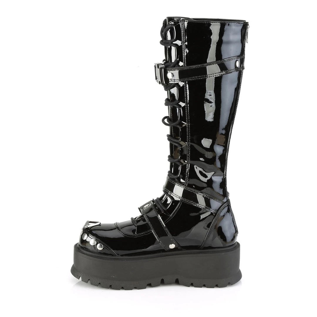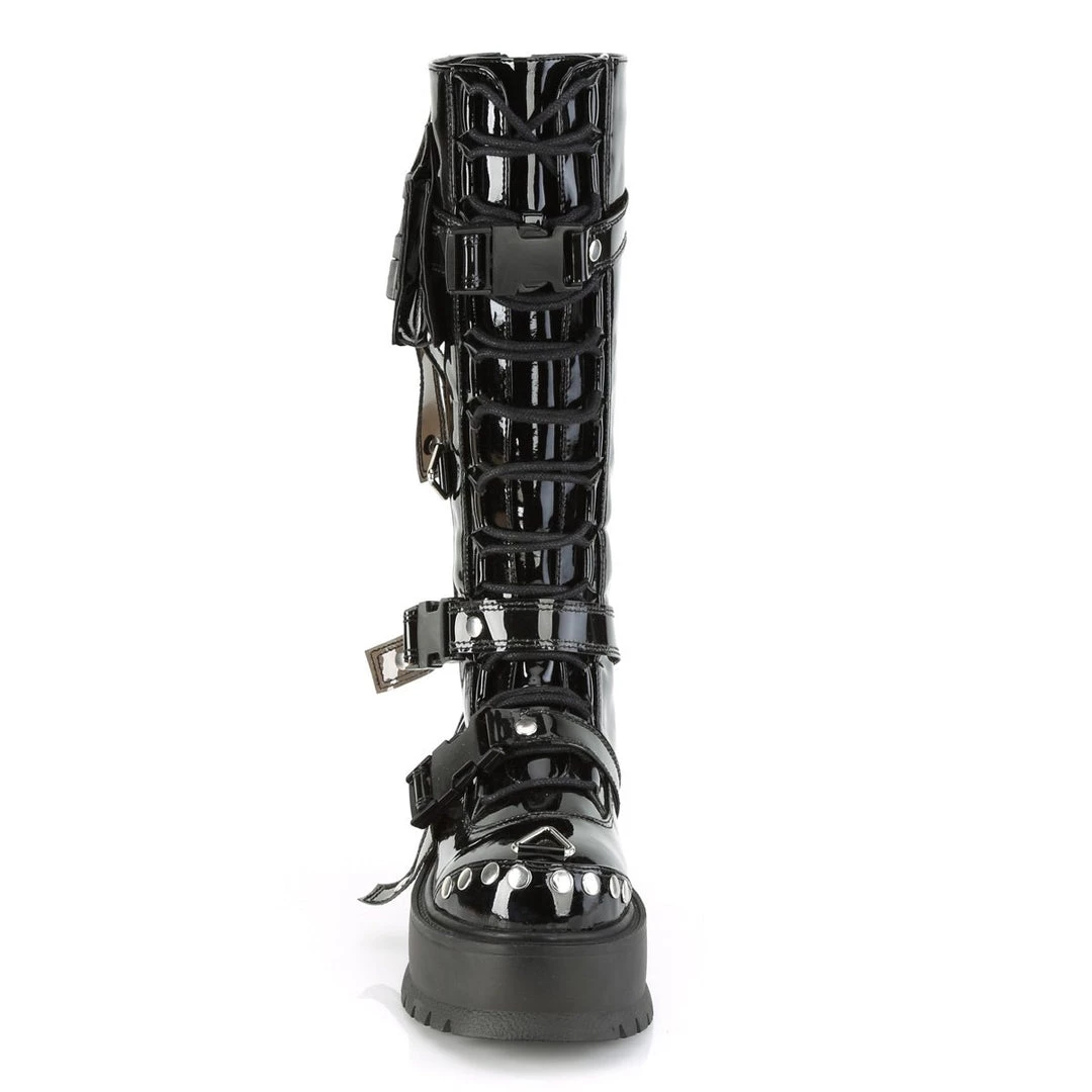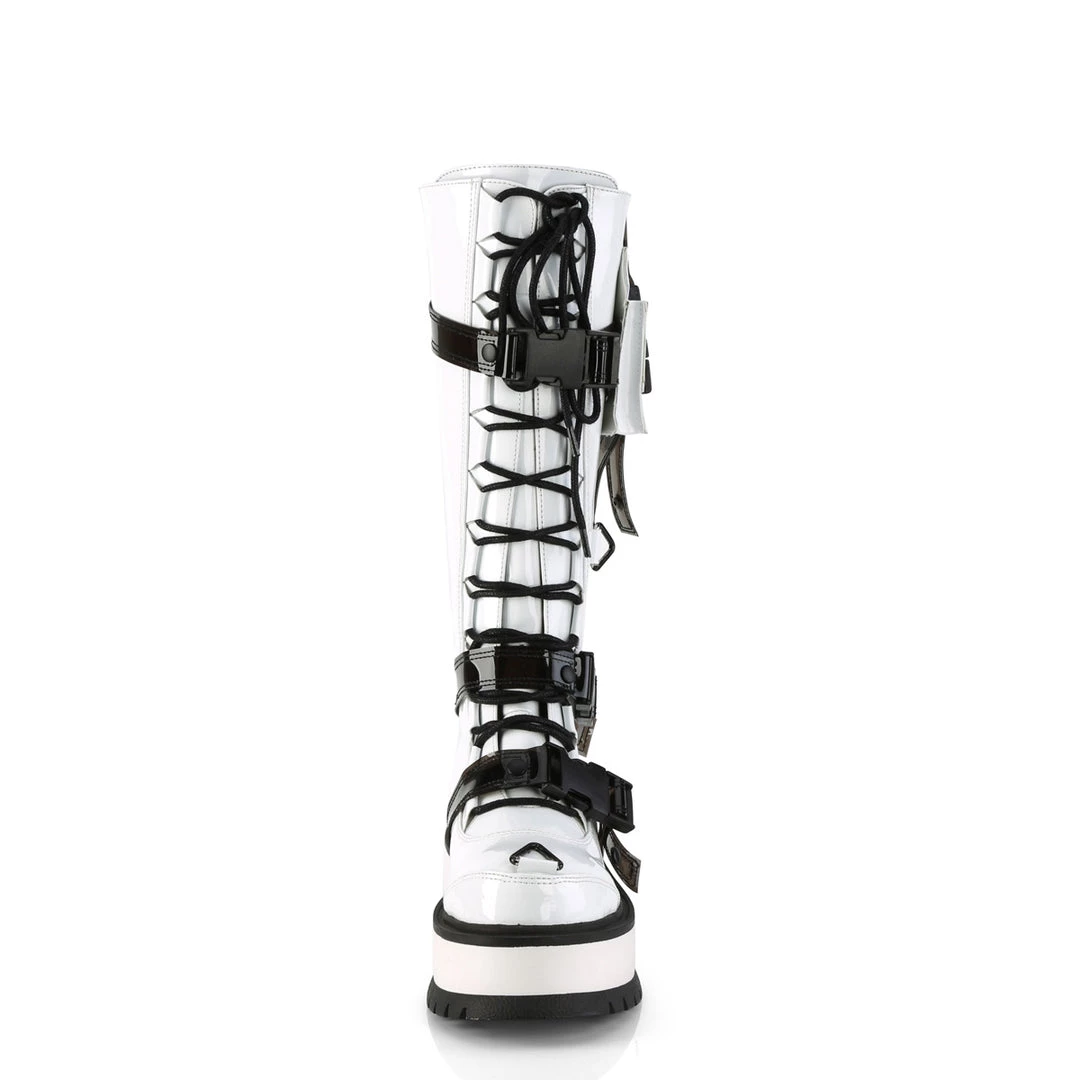 Stomp around in these 2″ (51mm) platform lace-up front knee high boot featuring cargo side pocket, quick release plastic buckle straps and studding & triangle ring details with full back metal zip closure.
