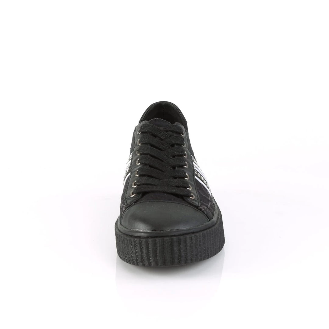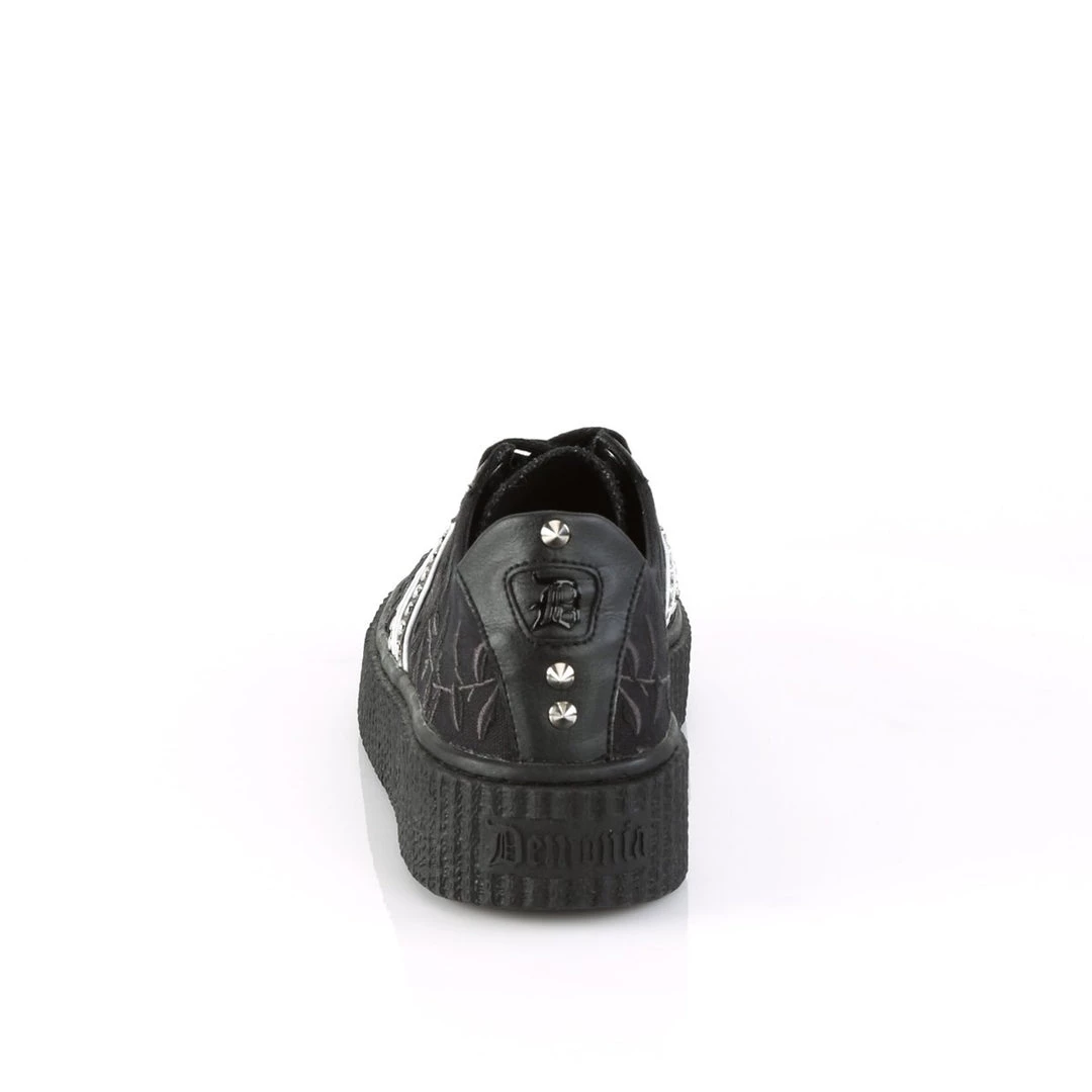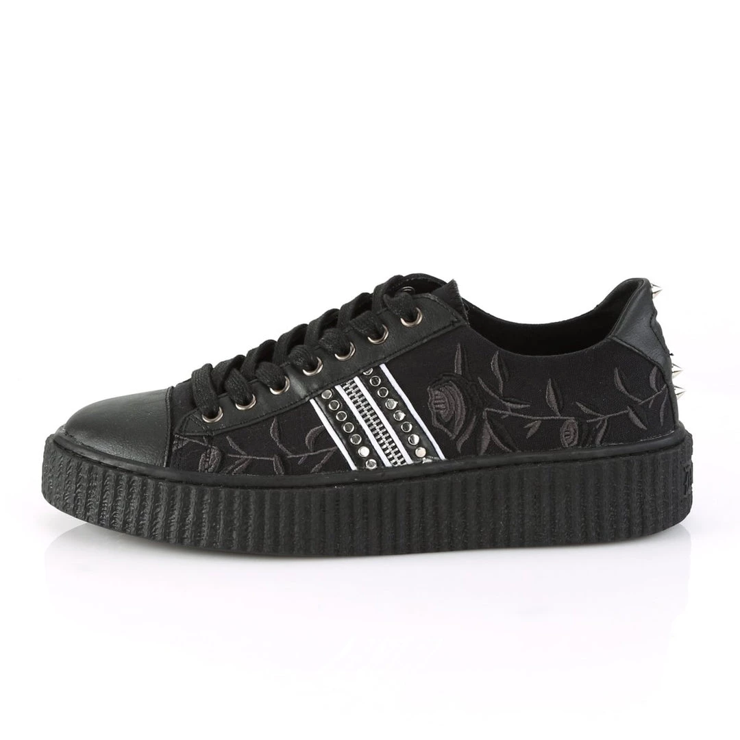 Take time to smell the flowers in these fun 1 1/2″ (38mm) platform rubber sole low top round toe lace-up front creeper sneakers featuring rose embroidery on vamp with stud and zipper trim up the sides.