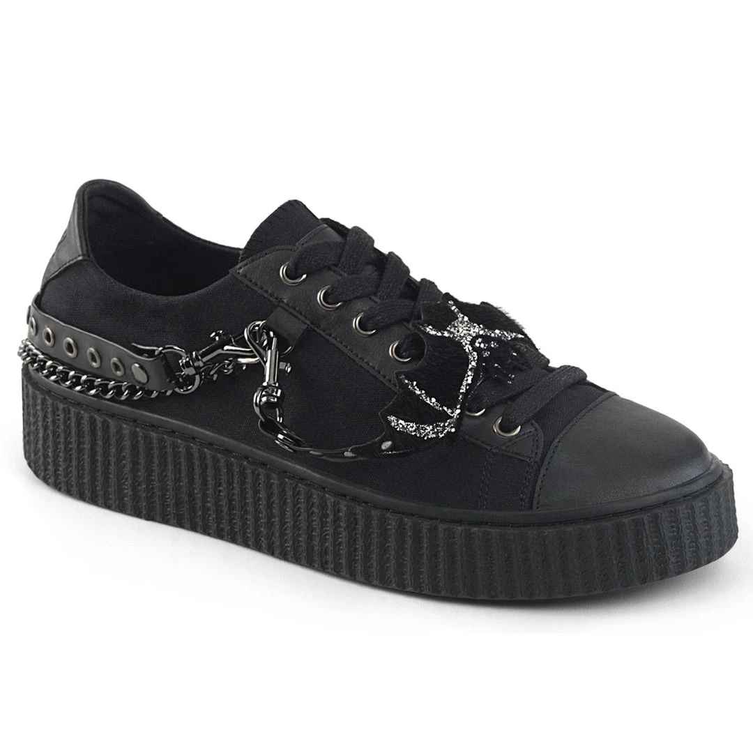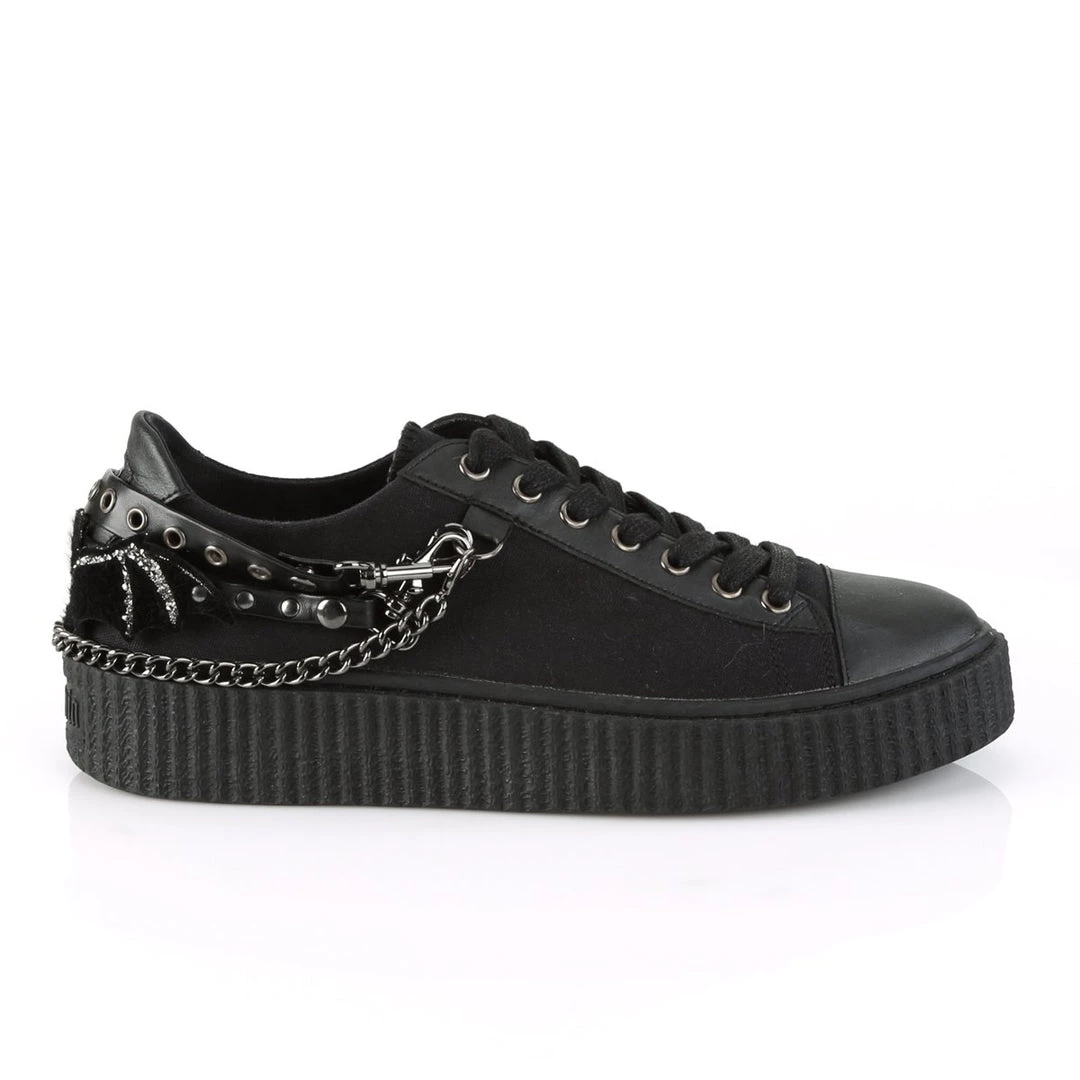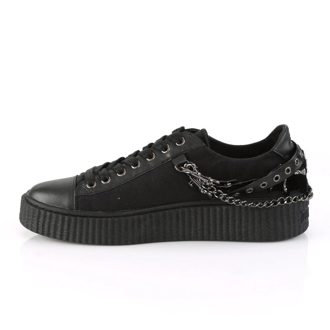 Fun 1 1/2″ (38mm) platform rubber sole low top round toe lace-up front creeper sneaker featuring 3 interchangeable metal chains on the heel.