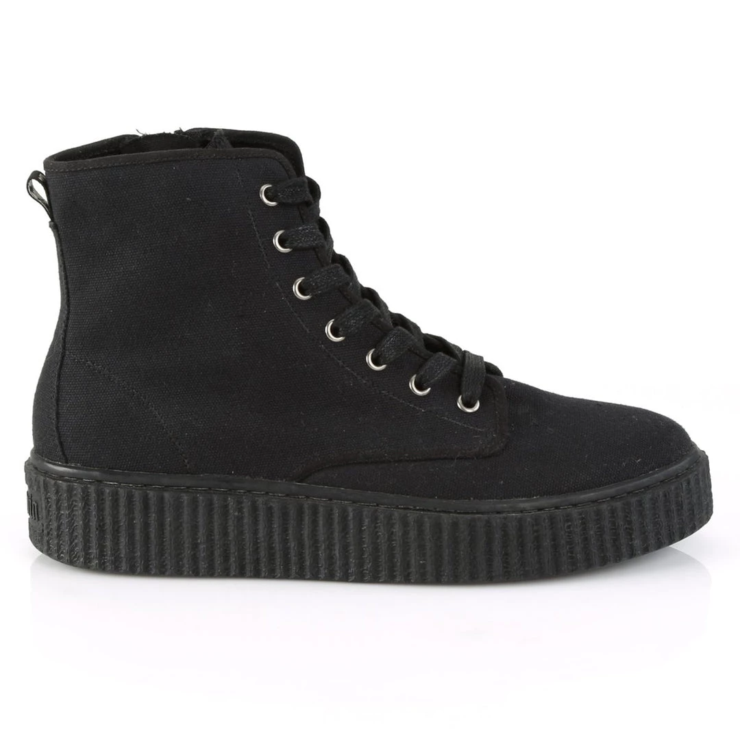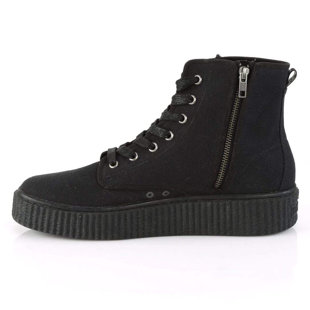 Classic, yet funky 1 1/2″ (38mm) platform rubber sole high top round toe lace-up front creeper sneaker, full inside metal zipper closure for easy wear and go.