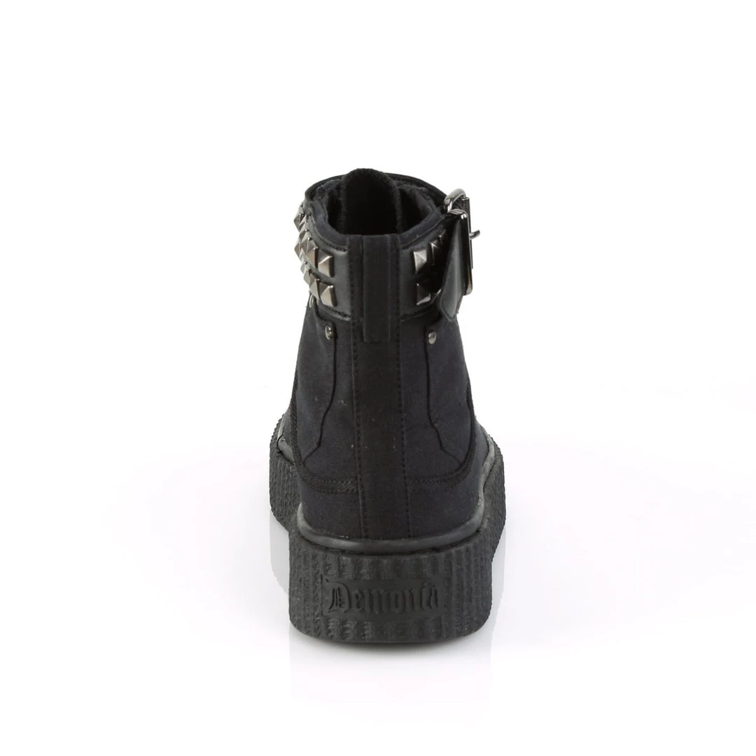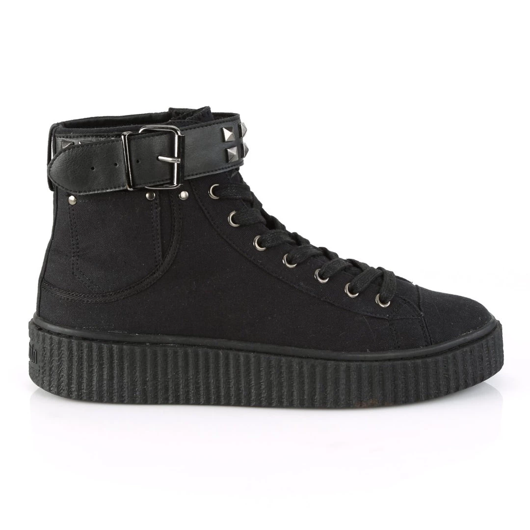 Fun & funky 1 1/2″ (38mm) platform rubber sole high top round toe lace-up front creeper sneaker featuring denim inspired pocket and pyramid studded belt strap.