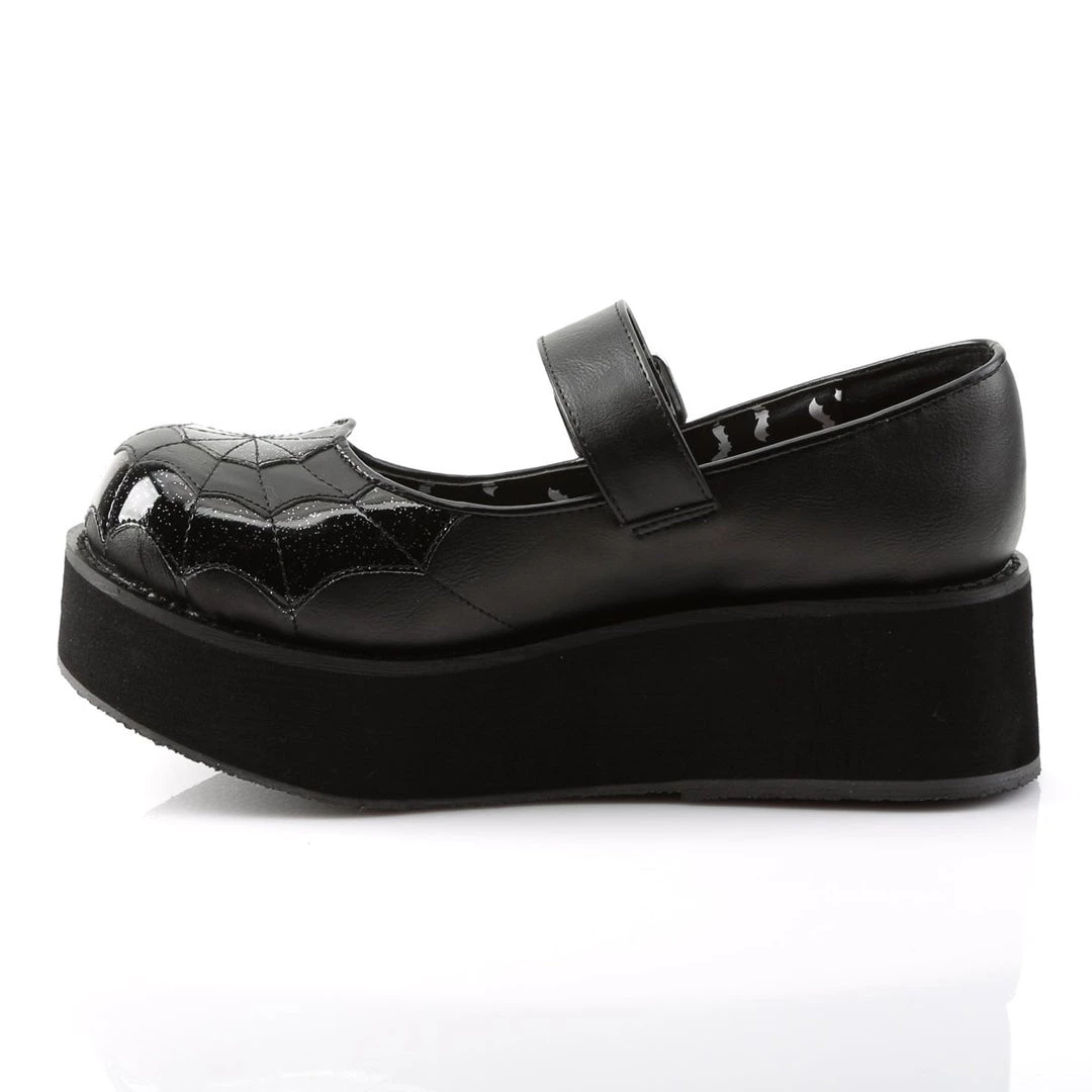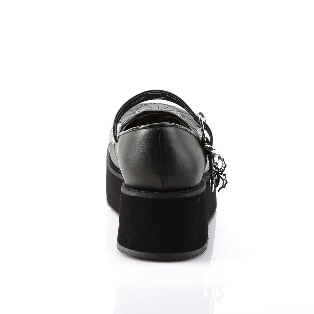 Spooky and comfortable, these 2 1/4″(6cm) platform Mary Janes feature a black spider web pattern on vamp & a spider charm.