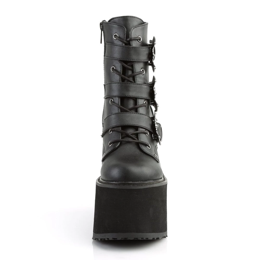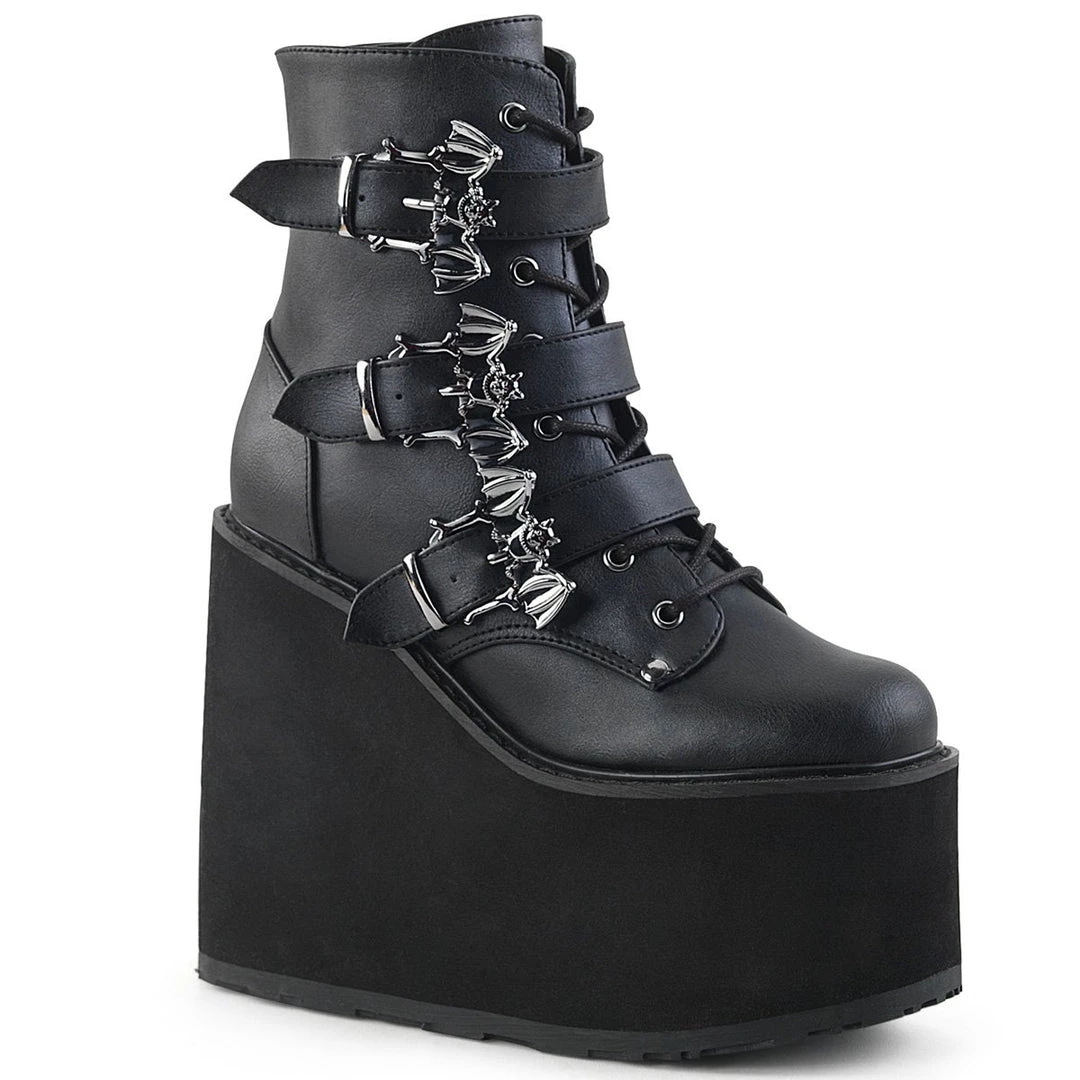 Show that edgy side with these 5 1/2″(140mm) wedge platform lace-up front ankle boot featuring triple bat buckle straps, metal inside zip closure.