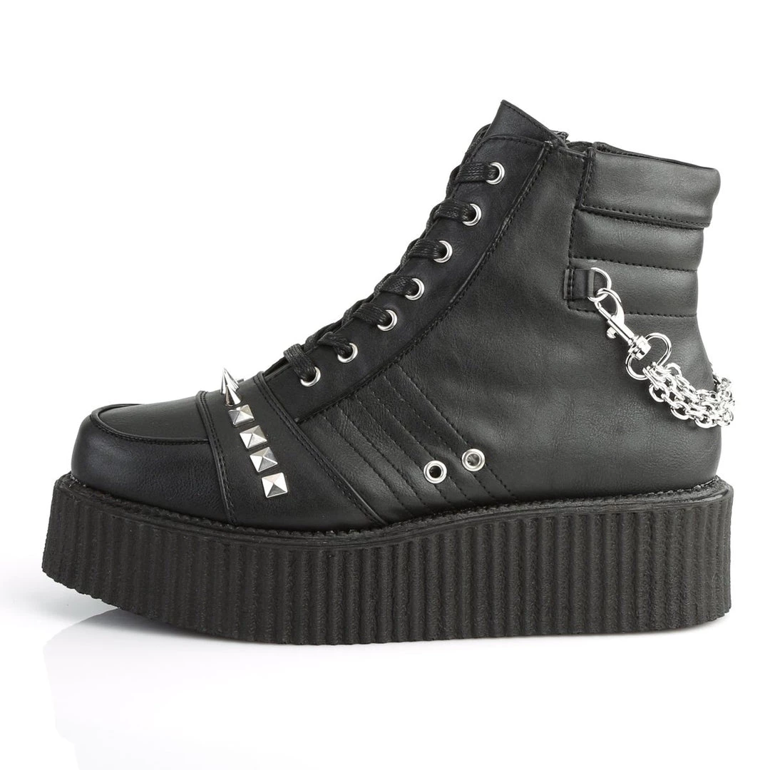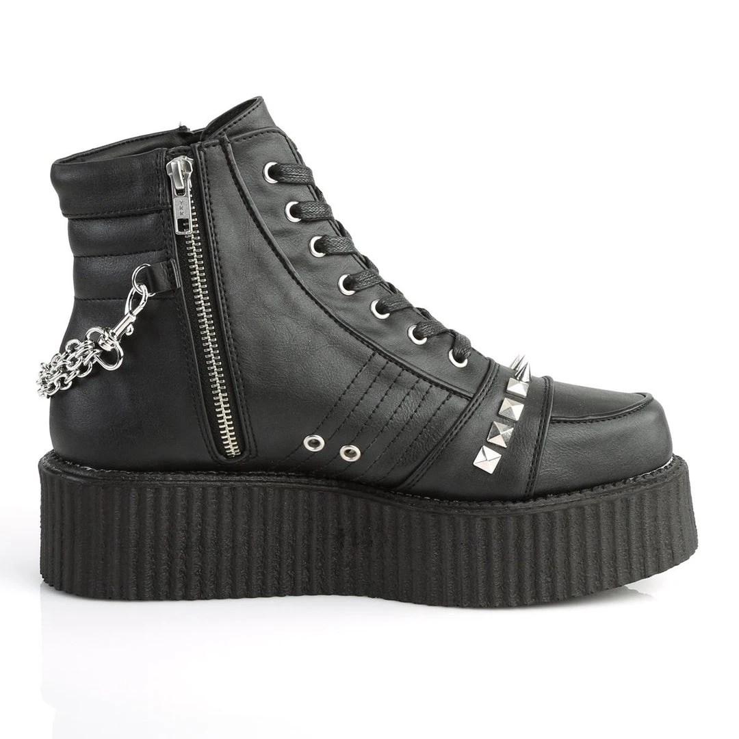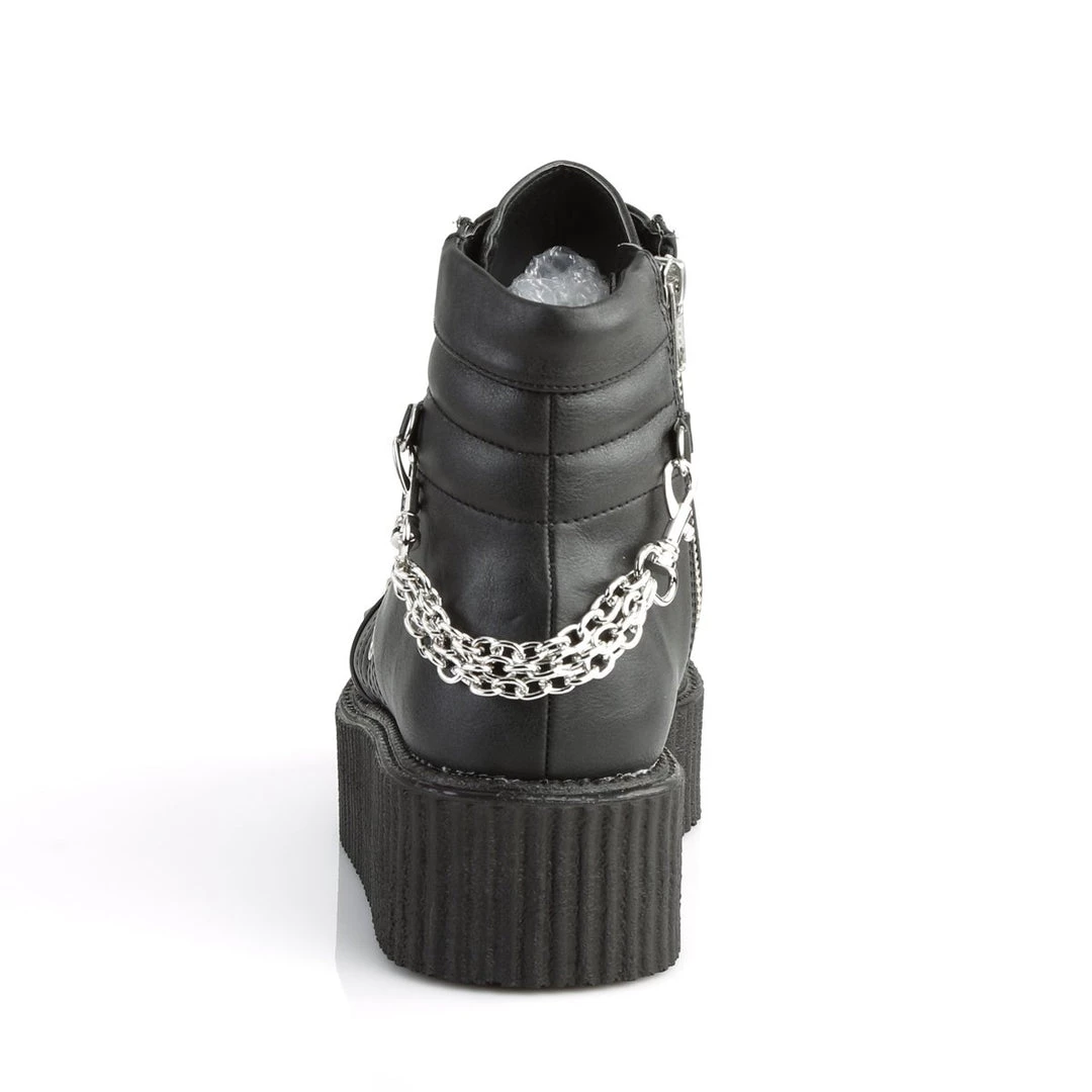Stylish with edge these 2″(5.1cm) platform Oxford creeper bootie with Stud, Spike, & Chain Details & exposed outer side zipper are sure to be a favourite.