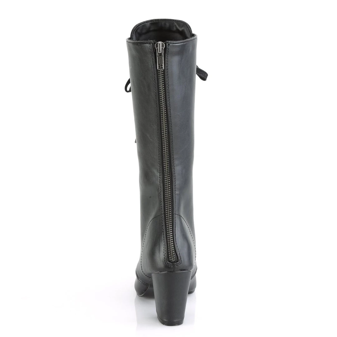 Funky with a touch of retro 3″ (76mm) block heel round toe lace-up mid-calf boot.