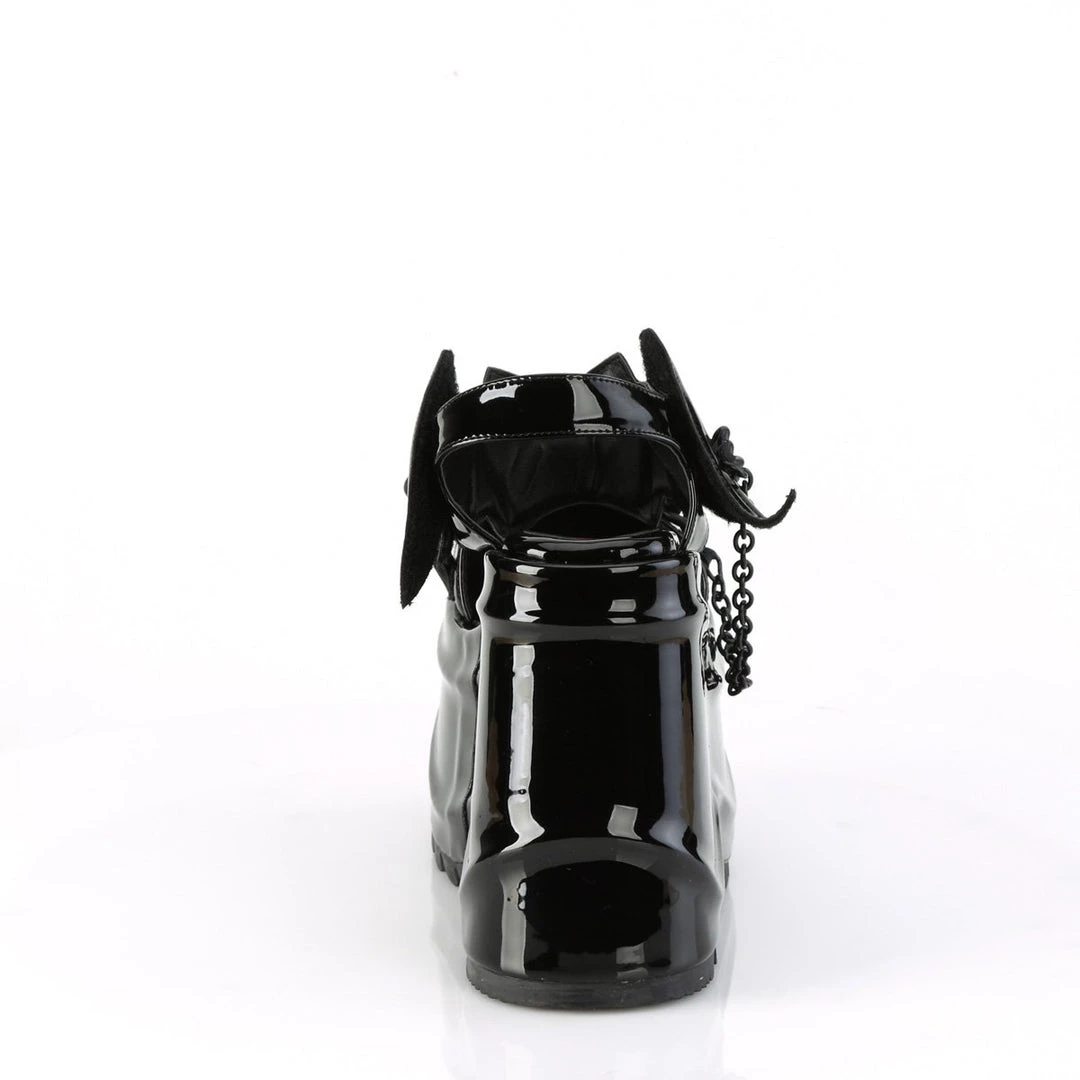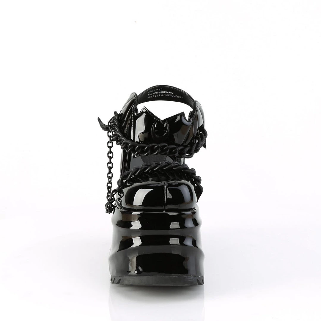 Go batty! Funky 6″ (152mm) wedge platform close toe ankle strap sandal featuring bat shaped hook & loop ankle strap closure with moon & chain details.