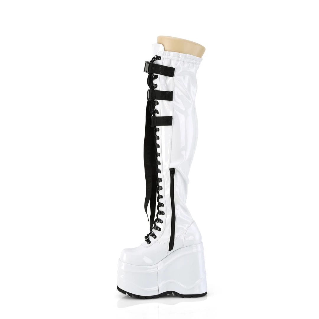 Get noticed in these 6″ (152mm) wedge platform lace-up stretch thigh high boots featuring 3 branded hanging nylon straps with snap buckles & elastic top with toggle, 1/2 length inside zip closure.