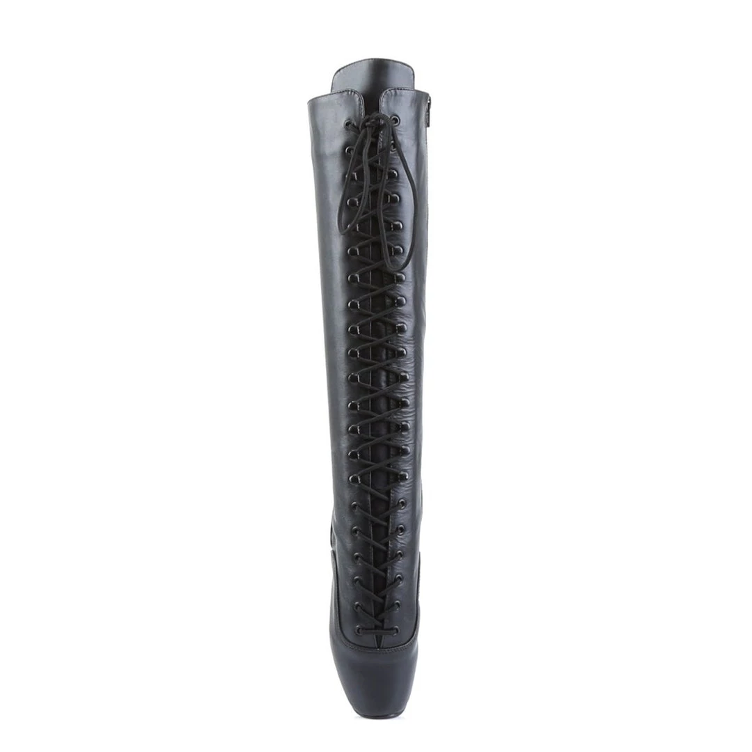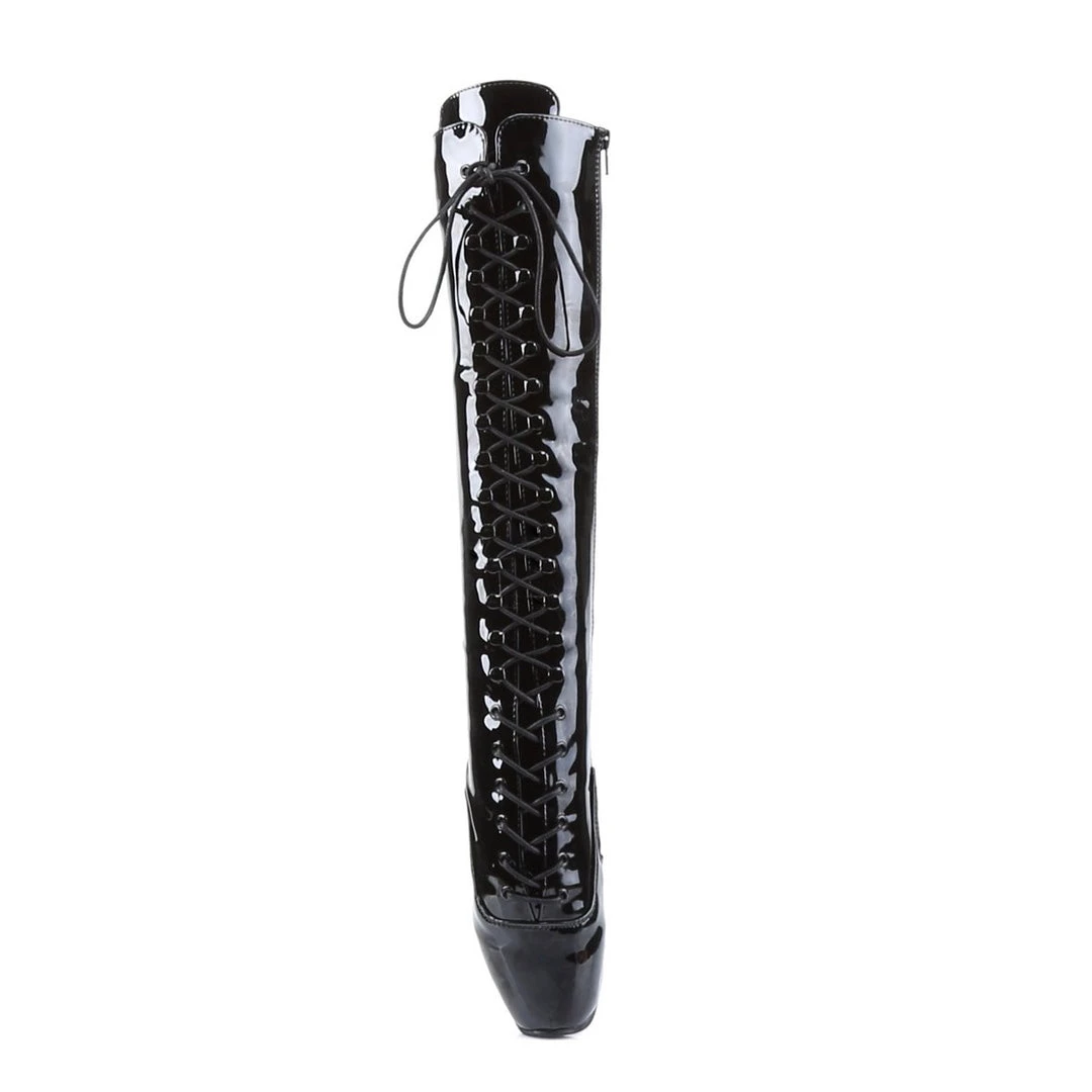 Knee-high black ballet boots with matching black ultra high stiletto heels, front tone-to-tone lace-up detail which enable a good fit, longer tongue and decorative stitching. The boots also feature a side zipper for easier put on and take off.