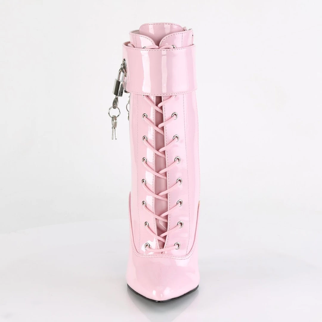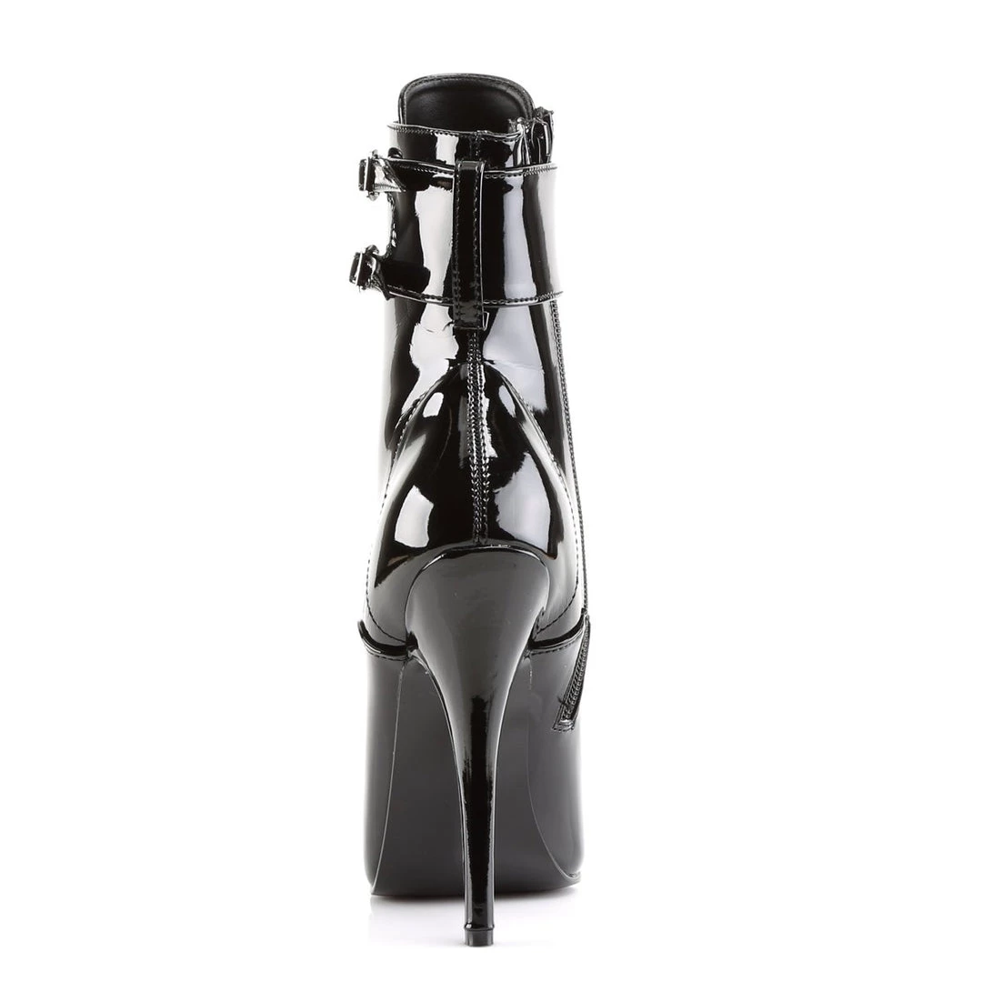 Chameleon-like black patent boots with ankle-high length. They feature front lace-up detail with tone-to-tone laces and metallic hoops, side zipper and delicate sewing which complements the minimalist look of these sexy boots. The top part features a detachable strap with double buckle. Other strap designs are also available for the model, so that your boots can change looks each time you change the ankle cuff.