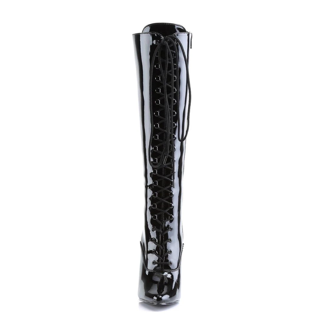 Knee-high black boots with front lace-up closure for an adjustable fit that will perfectly wrap your feet, a side zip closure for those times when you want an easy take off and pointed toe for a slender foot look. The 6 inch (15 cm) high stiletto heel lengthen the legs and add that sexy touch.