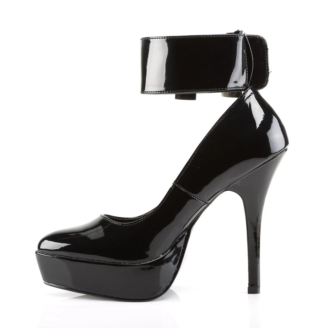 Black court shoes crafted in glossy patent with court design, pointed toe, 5 inch (12.5 cm) high stiletto heels and front platform with black patent overlay for an uniform look. A wide black patent ankle strap with double metal padlock closure transforms these classic courts into highly provocative fetish shoes.