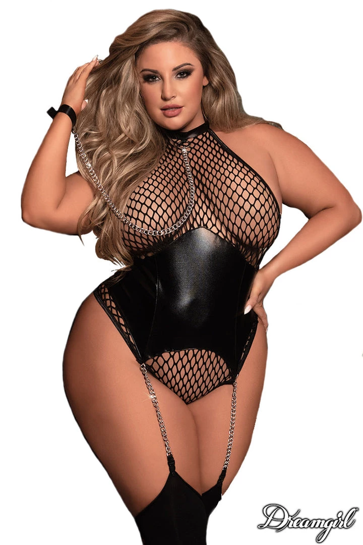 Women empowerment! Big net teddy with a high halter neckline featuring an attached silver leash, a glossy faux leather front with attached chain front garters, and an open G-String back with 2 thick adjustable elastic straps. Shown with DG0215 thigh highs; sold separately.